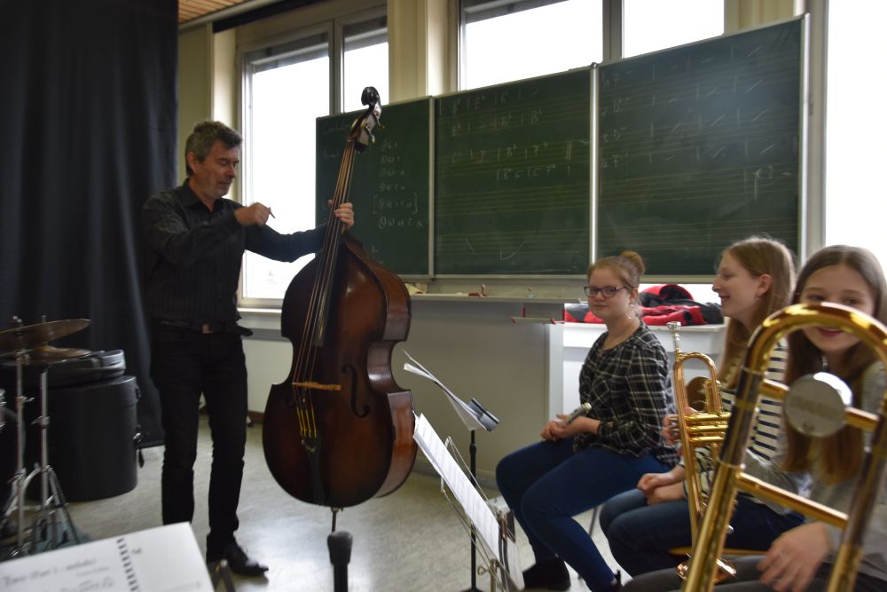 In lockerer Atmosphäre wurden die Schülerinnen von den drei engagierten Mitgliedern des Christof-Heringer-Trios angeleitet und zu ansprechenden Soloimprovisationen motiviert. Eine solche Improvisation erfordert vor allem Mut: Man muss etwas spielen, was nicht in den Noten steht und kann sich lediglich an einem Harmonieschema orientieren. Hauptsache, man traut sich! Der Bassist Matthias Wolf fasste das so zusammen: "Es kann ja sein, dass einem nichts einfällt, aber dann spielt man trotzdem."