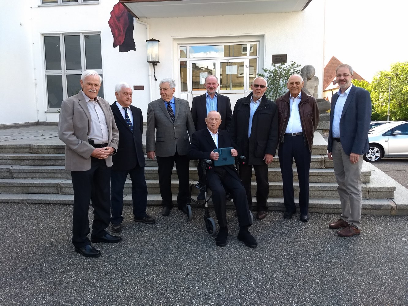 Am Mittwoch, 22.05.19, durfte ich Absolventen unseres Gymnasiums 60 Jahre nach ihrem Abitur willkommen heißen; darunter mit Dr. Emil Kunz auch ein ehemaliger Kollege. Der Abiturjahrgang 1959 hat nach dem Krieg noch im "Ausweichquartier" in der Lemberger Straße begonnen und konnte dann später in den damaligen Neubau des heutigen Schulhauses einziehen. 14 Schüler (der Jahrgang war eine reine "Männersache") haben damals das Abitur bestanden. Es war für mich schön zu sehen, wie sehr alle noch ihrer alten Schule verbunden sind und wie sehr die Schulzeit doch mit guten Erinnerungen verbunden ist. Und erstaunlich - dass das schriftliche Abitur im Januar geschrieben wird, ist keine Erfindung der Bildungspolitik der letzten Jahre; so mussten auch im Jahr 1959 die Abiturienten schon im Januar in vier Fächern zur schriftlichen Prüfung antreten: Mathematik, Deutsch, Englisch und Physik oder Chemie. Dass die Absolventen nach 60 Jahren ihre alten Abiturarbeiten noch einmal in Händen halten konnten, war für alle eine schöne Erinnerung.