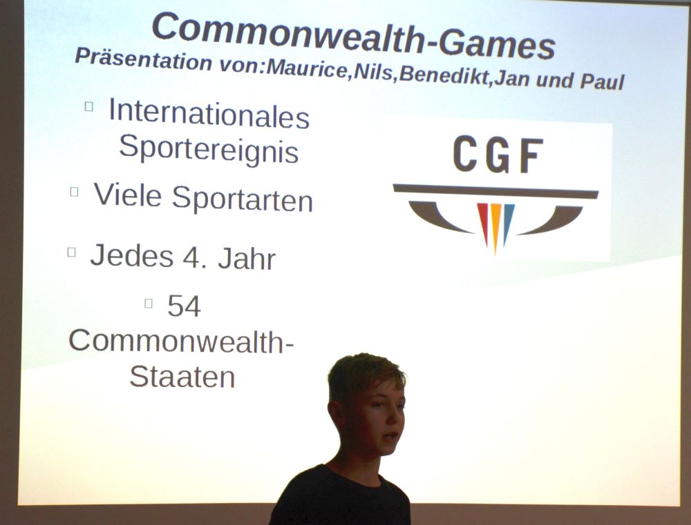 Am Dienstagabend, den 11.02., präsentierten die Schüler der Jahrgangsstufe 7 einem großen Eltern-Publikum ihre Vortragskunst. Unter dem Oberthema „Commonwealth" zeigten die Schüler ihre Methoden- und Kommunikationskompetenz: bildgestützte Präsentationen, freier Vortrag und informative Spielszenen wurden aufgeboten. [Mehr...]