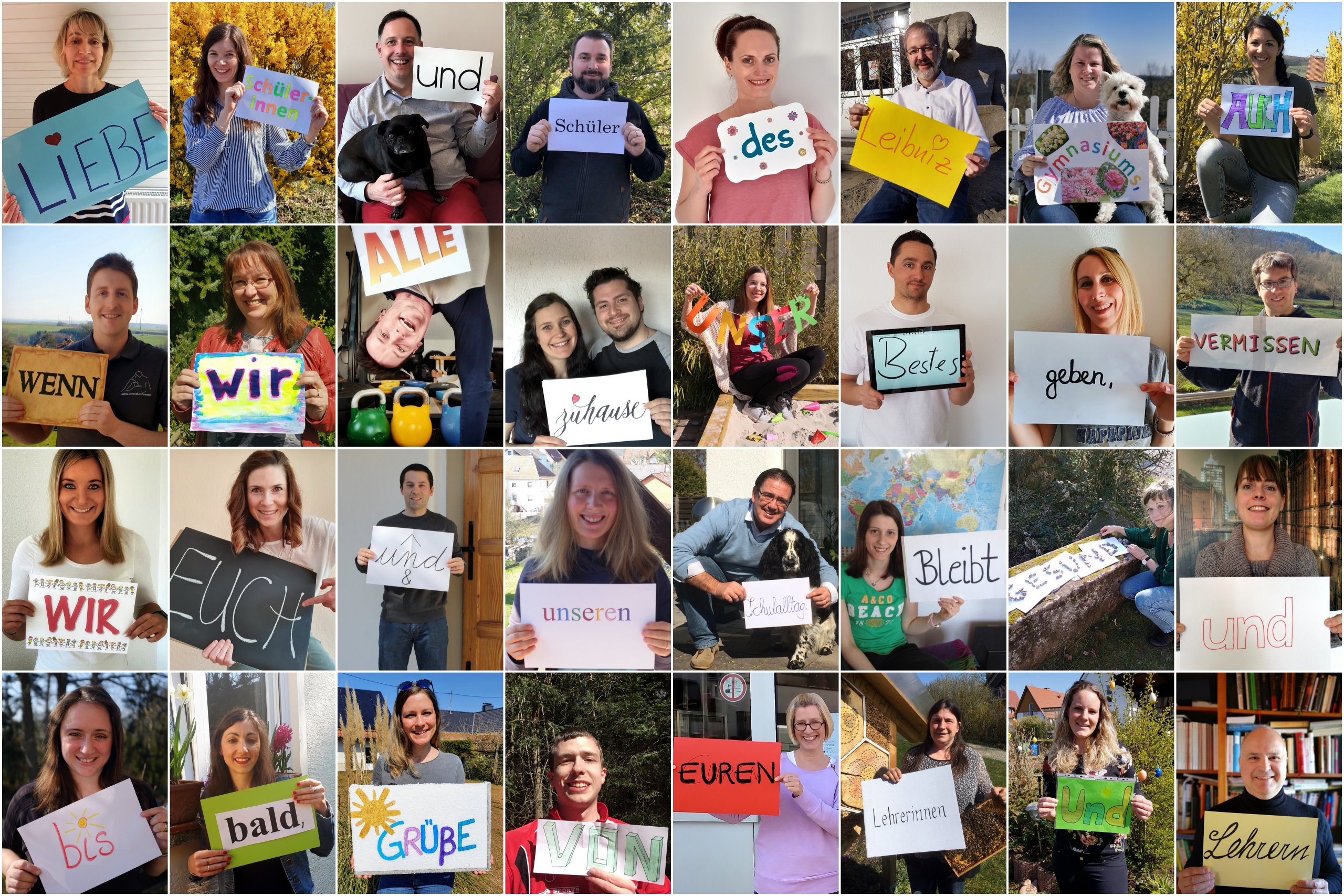 Eine tolle Idee hatten einige Kolleg(inn)en kurz vor den Osterferien. In nur zwei Tagen wurde eine Collage aus Bildern erstellt mit einem Gruß an unsere Schülerinnen und Schüler, die wir vermissen ...