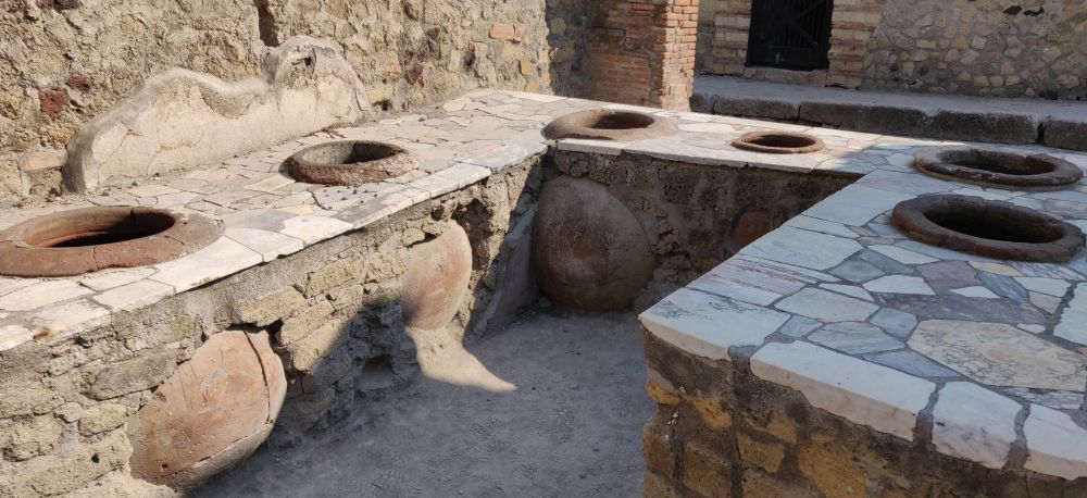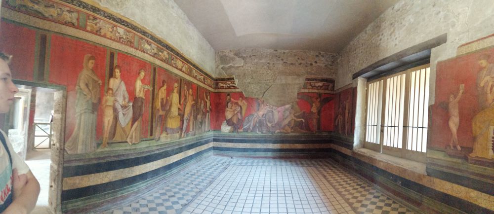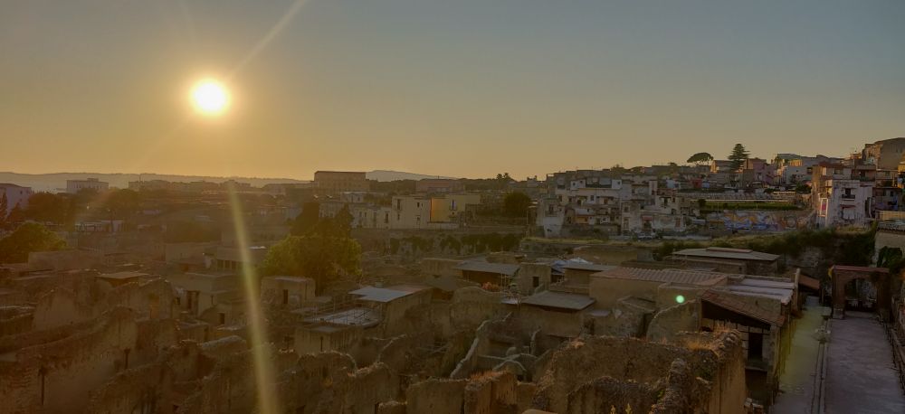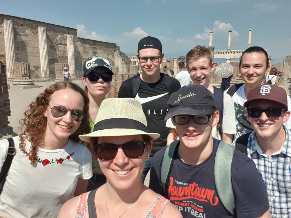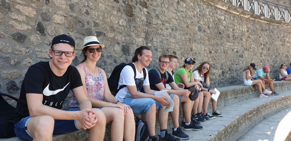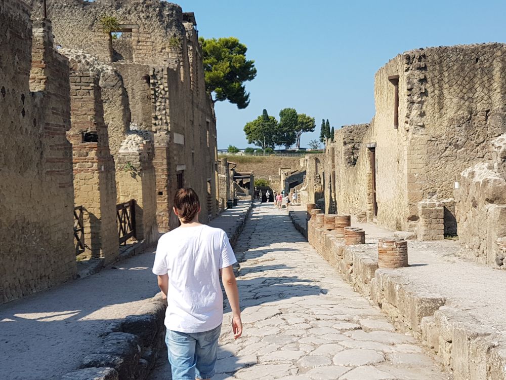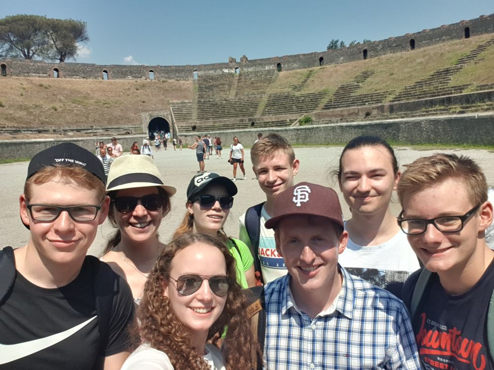 Am Mittwochmorgen des 21. Augusts machte sich unsere überschaubare Gruppe des Latein-LKs zusammen mit Frau Sooss und Herrn Lutz an die nächste Tour nach Kampanien. Gegen 7 Uhr morgens ging es für uns mit dem Zug aus Pirmasens Nord nach Karlsruhe, von wo aus uns der IC schließlich nach Basel brachte. Innerhalb weniger Stunden zogen wir durch Deutschland und die Schweiz nach Frankreich an den Airport und machten uns entspannt ans Einchecken. Entspannt gerade deshalb, weil unser Flug eine gute Stunde Verspätung hatte, die unsere Planung ein wenig über den Haufen warf. Die Zeit wussten wir aber sinnvoll zu nutzen. Die Witze und Lachanfälle die ganze Fahrt über kamen schließlich nicht von ungefähr. Nach einem bequemen Flug ohne weitere Zwischenfälle landete unsere Gruppe schließlich in Neapel, von wo aus wir direkt in unser hübsches Hotel zogen. Nach einer kurzen Ruhepause fing unser Sightseeingplan auch schon an: Abends ging es für uns Touris sofort mit der Regionalbahn in die kleinere Stadt Herculaneum, um die Ausgrabungen der Altstadt zu besichtigen. Hier machte uns unser verspäteter Flug allerdings einen Strich durch die Rechnung, denn die Ausgrabung war bereits geschlossen. Dennoch wussten wir uns zu helfen und machten einen Abstecher ans Meer, begeisterten uns an unserem ersten italienischen Eis und probierten die italienische Küche, die uns die nächsten gemeinsamen Abende mit Pizza und Pasta begleiten sollte.