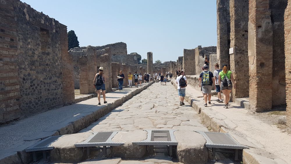 Am nächsten Morgen nach einer relativ kurzen Nacht machten wir uns nach einem regelrechten Nutellaschock beim Frühstück daran, unsere Pläne aufzuholen: Sofort ging es zurück nach Herculaneum, um schlussendlich doch die Ausgrabungen zu besichtigen und die tragische Geschichte der Stadt zu erleben. Selbstverständlich verschonte Herr Lutz auch uns nicht und traditionsgemäß durften wir damit beginnen, unsere Vorträge zu den einzelnen Sehenswürdigkeiten zu halten. Gleich danach ging es auch schon weiter nach Pompeji. Währenddessen war die Temperatur schon längst über 30 Grad geklettert. Bei guten 35°C geisterten wir mehrere Stunden durch die riesige Altstadt Pompejis. Bei dieser Hitze erwiesen sich uns die antiken Brunnen in der gesamten Stadt als Segen. Die Erleichterung war uns förmlich anzusehen. Von Brunnen zu Brunnen hetzend schafften wir es schließlich durch die ganze Stadt und machten uns auf zum nächsten Highlight: Mit dem Bus ging es schließlich den Vesuv hoch, auf dessen Spitze allerdings ein weiterer heißer, steiler Fußweg auf uns wartete. Doch die Mühe zahlte sich aus: Oben erwartete uns eine erstaunliche Aussicht auf den Golf von Neapel, Herculaneum und Pompeji und auch der Blick in den Krater war beeindruckend. Dieser Tag war mit Abstand am anstrengendsten, doch es hatte sich gelohnt. Wir waren in Herculaneum, Pompeji, auf dem Vesuv und das allerwichtigste: Wir hatten unser erstrebtes Schrittziel von über 30.000 erreicht, mehr wollten wir auch gar nicht.