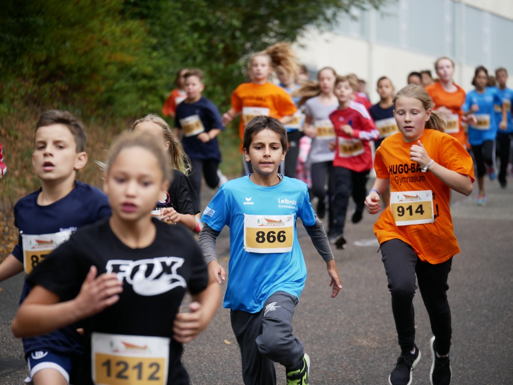 Von den weiterführenden Schulen konnte das Leibniz somit die meisten Teilnehmer an die Startlinie bringen. So waren es auch unsere schuleigenen Laufshirts mit dem "lesenden Schüler" in den Farben "navy" und "curacao", die die Laufwettkämpfe vor Ort optisch prägten.
