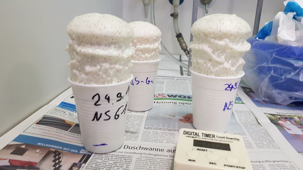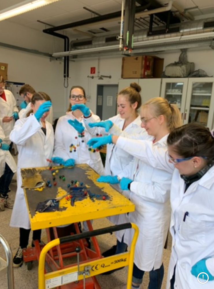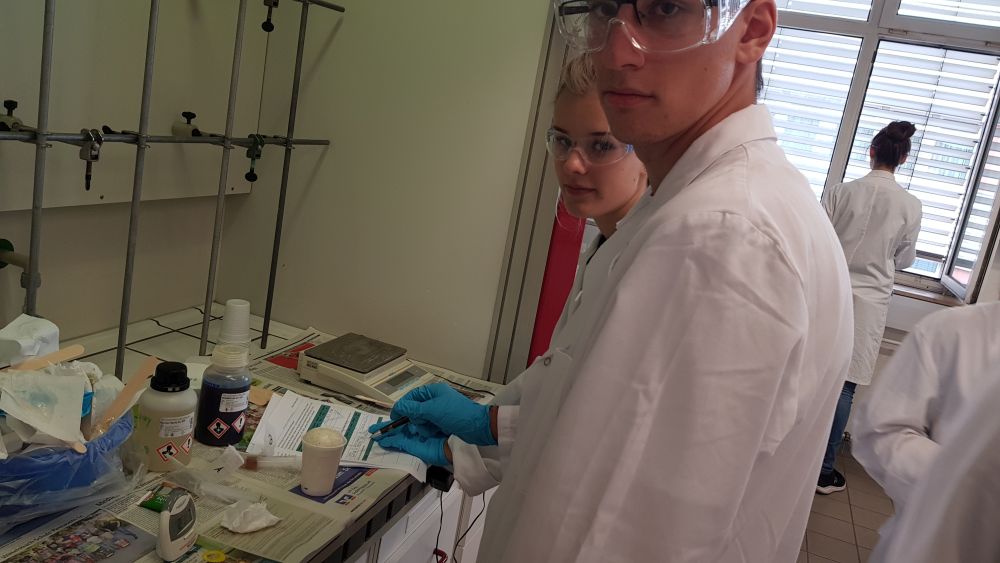 Zunächst haben wir einleitende Vorträge von Herrn Göpel, Presse- und Kommunikationsarbeit der Chemieverbände Rheinland-Pfalz, und Herrn Stumm, Studiengangsleiter Angewandte Chemie Hochschule Kaiserslautern, gehört. Danach wurden wir in drei Gruppen eingeteilt, die gemeinsam verschiedene Experimente durchführten. Zu diesen gehörten das Aufschäumen von Polyurethan, Testen von Superabsorbern in Windeln und die Herstellung von Flummis.