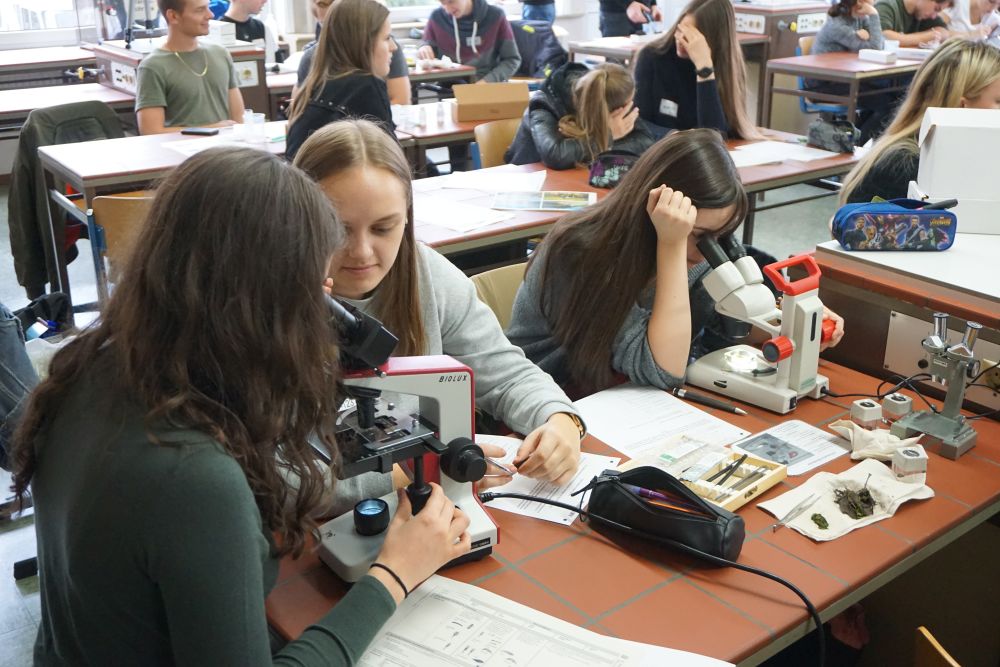 Am 27.09.2019, kurz vor den Herbstferien, besuchten uns auf Initiative von Frau Hoock und Frau Betz mehrere Studenten der Uni Landau für eine Gewässerexkursion in den Strecktalpark. Diese fiel leider, der technischen Geräte wegen, buchstäblich ins Wasser. Da der Regen uns einen Strich durch die Rechnung machte, mussten wir uns darauf beschränken, in der Schule zu experimentieren und machten uns in Kleingruppen aufgeteilt an die Arbeit. Nach einer technischen Einführung untersuchten wir verschiedenste mitgebrachte Wasserproben auf deren chemische Eigenschaften (bspw. pH-Wert oder Sauerstoffgehalt). Außerdem bot sich uns die Möglichkeit, die Wasserproben und damit die verschiedenen Lebewesen der Biotope unter dem Mikroskop zu untersuchen.