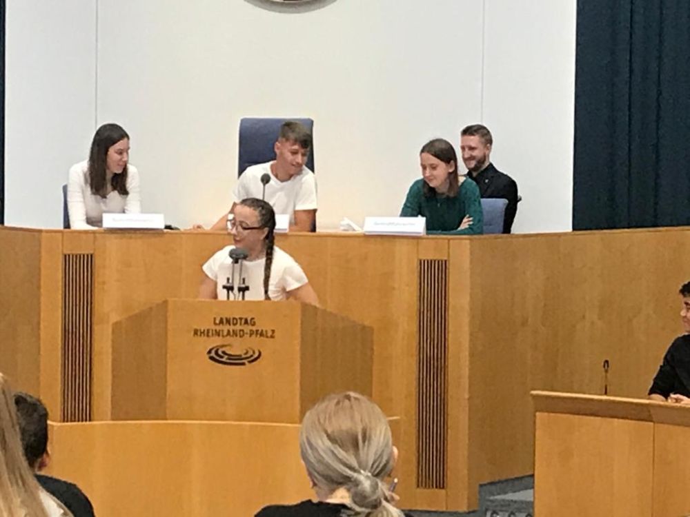 Am Donnerstag, dem 24.10.2019, fuhr die gesamte Klasse 10 des Leibniz-Gymnasiums nach Mainz in den rheinlandpfälzischen Landtag. Dort verbrachten wir den Vormittag im Plenarsaal und führten ein Rollenspiel durch, welches uns die echten Plenarsitzungen der Abgeordneten näher bringen sollte. Wir durften über die Streitfrage "Führerschein ab 16 Jahren" diskutieren, dazu wurden wir alle einer Fraktion zugeteilt, die jeweils eine andere Meinung zu dem Thema hat.