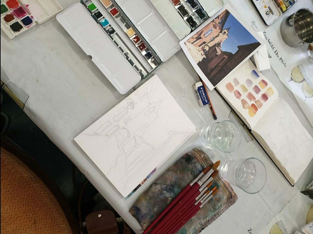 Am 18.1.20 trafen wir uns um 9:30 Uhr in Frau Fünffingers Atelier in Hainfeld. Zuerst erklärte sie uns einige Grundlagen über die Aquarellmalerei und dann ging es auch schon mit der praktischen Arbeit los.