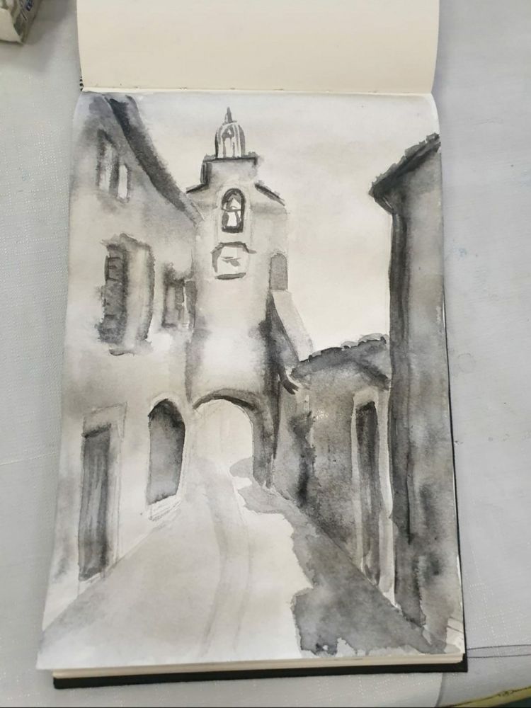 Es wurde zuerst eine monochrome Tonwertskizze angefertigt, sodass man die verschiedenen Hell- und Dunkelkontraste erkennen konnte. Diese brauchte man um später das richtige Aquarell anzufertigen. Nachdem die Tonwertskizze angefertigt wurde, fertigte ich eine Bleistiftskizze auf Aquarellpapier. Schließlich suchte ich mir 4 Farben aus, die ich für mein Aquarell verwendete. Diese sind die einzigsten Farben, die man für sein Aquarell verwendet. Durch Mischen und bestimmten Techniken beim Auftragen der Farben kann man bestimmte Stimmungen und Ergebnisse erzielen. Besonders wichtig bei der Aquarellmalerei ist der Einsatz von Wasser. Man platziert die Farbe und das Wasser so auf dem Papier, dass die Farben fließen und sich unkontrolliert verteilen, so erhält man die schönsten Ergebnisse. Deswegen auch das ,, spontane" Aquarell, da man nicht weiß, wie sich die Farben verteilen. Da man auch nichts beeinflussen soll, sondern die Farbe macht, was sie will.