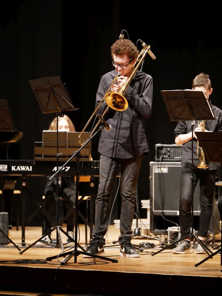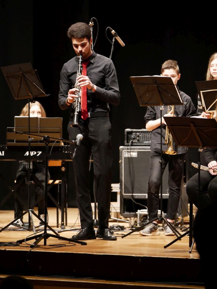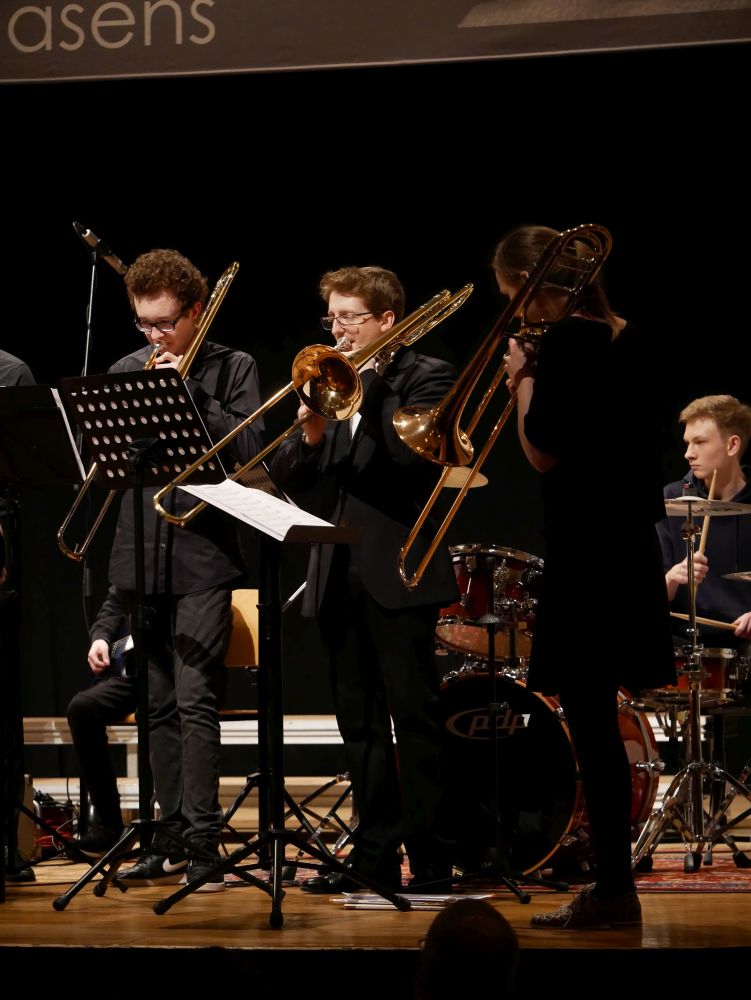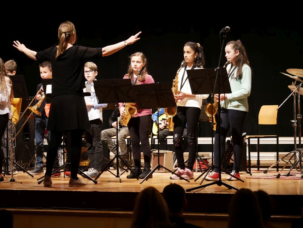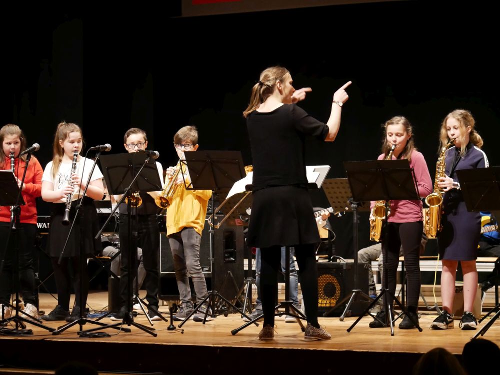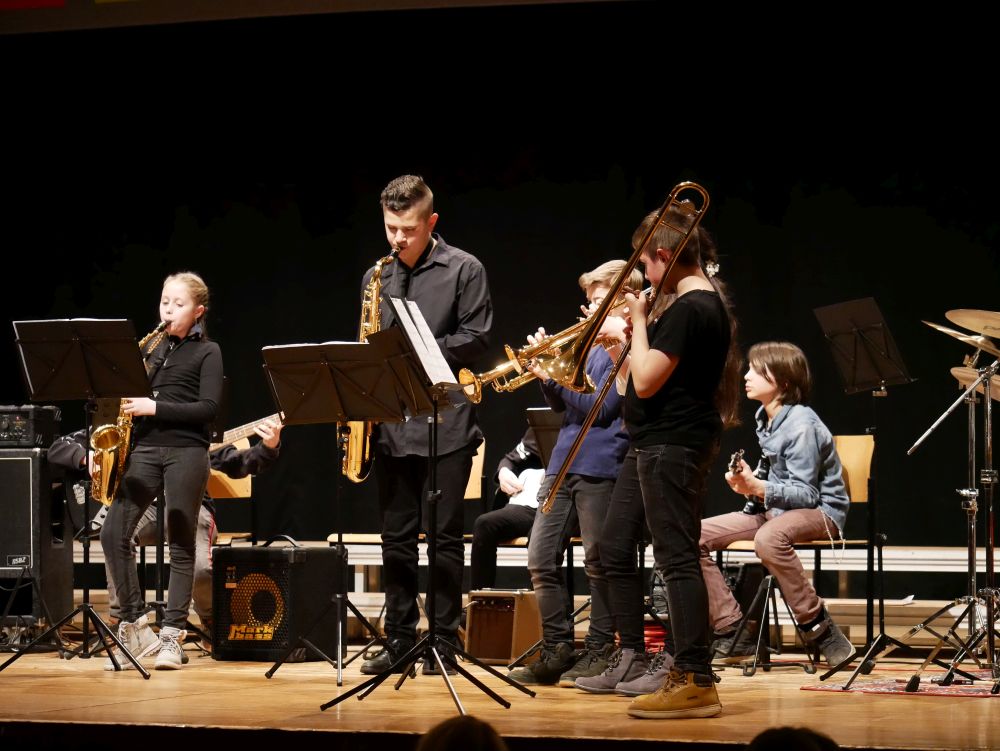 Zu Beginn der Veranstaltung zeigten die mutigen Schülerinnen und Schüler der Big Band Klasse 5, was sie im letzten halben Jahr gelernt hatten. Trotz, dass die Schülerinnen und Schüler erst seit Beginn des Schuljahres mit den Instrumenten arbeiten, präsentierten sie unter der Leitung von Frau Knörzer ihr Können mit den Stücken „Shotgun" und einem Auszug aus „Louie, Louie". Nach der anschließenden Begrüßung des Schulleiters Herrn Mohr, der mit einem Zitat Goethes, dass man nur dann ein ganzer Mensch sei, wenn man die Musik nicht nur genieße, sondern diese auch selbst machen würde, seine Rede schloss, zeigte die Big Band Klasse 6, dass sie nicht nur ganze Menschen sind, sondern auch, was sie in den letzten eineinhalb Jahren gelernt haben. Unter der Leitung von Frau Vehling präsentierten sie die Stücke „Dragonfire" und „Trumpet Hero".