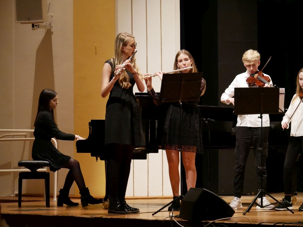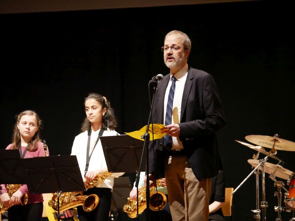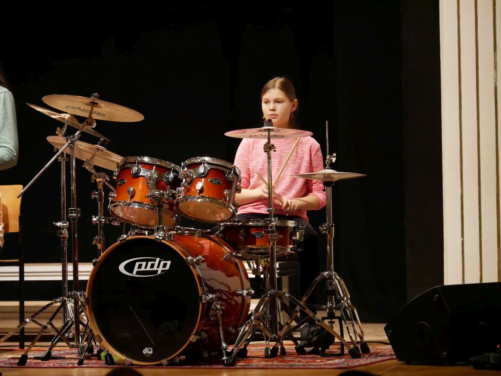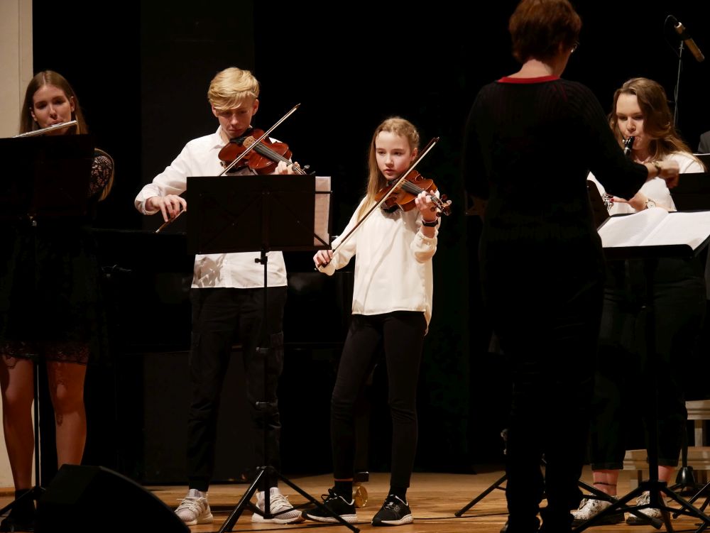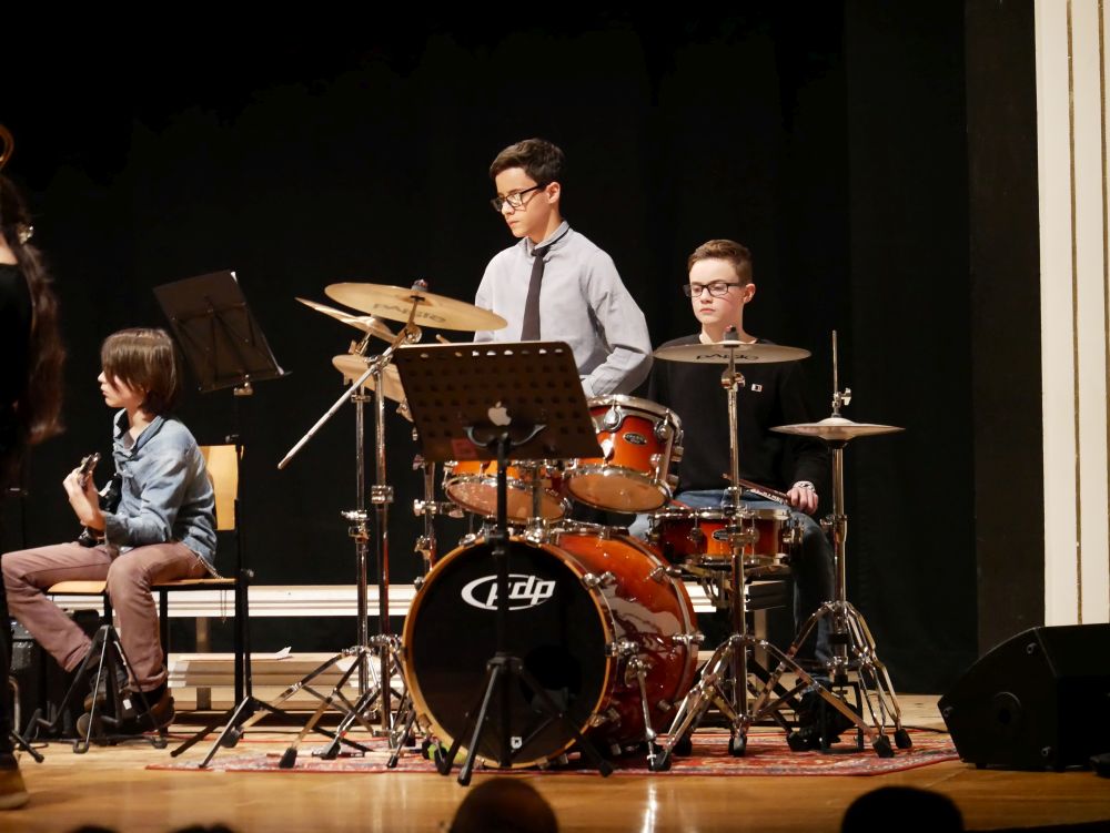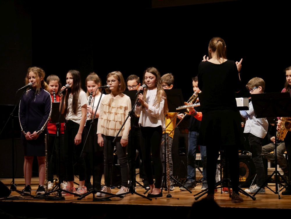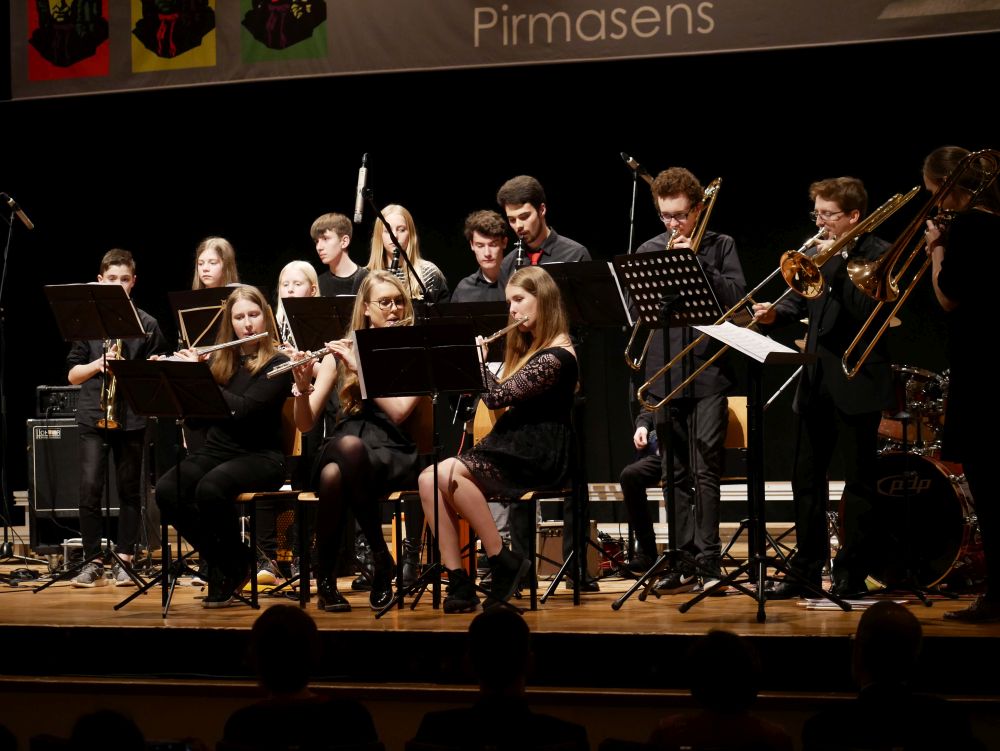 Zu Beginn der Veranstaltung zeigten die mutigen Schülerinnen und Schüler der Big Band Klasse 5, was sie im letzten halben Jahr gelernt hatten. Trotz, dass die Schülerinnen und Schüler erst seit Beginn des Schuljahres mit den Instrumenten arbeiten, präsentierten sie unter der Leitung von Frau Knörzer ihr Können mit den Stücken „Shotgun" und einem Auszug aus „Louie, Louie". Nach der anschließenden Begrüßung des Schulleiters Herrn Mohr, der mit einem Zitat Goethes, dass man nur dann ein ganzer Mensch sei, wenn man die Musik nicht nur genieße, sondern diese auch selbst machen würde, seine Rede schloss, zeigte die Big Band Klasse 6, dass sie nicht nur ganze Menschen sind, sondern auch, was sie in den letzten eineinhalb Jahren gelernt haben. Unter der Leitung von Frau Vehling präsentierten sie die Stücke „Dragonfire" und „Trumpet Hero".
