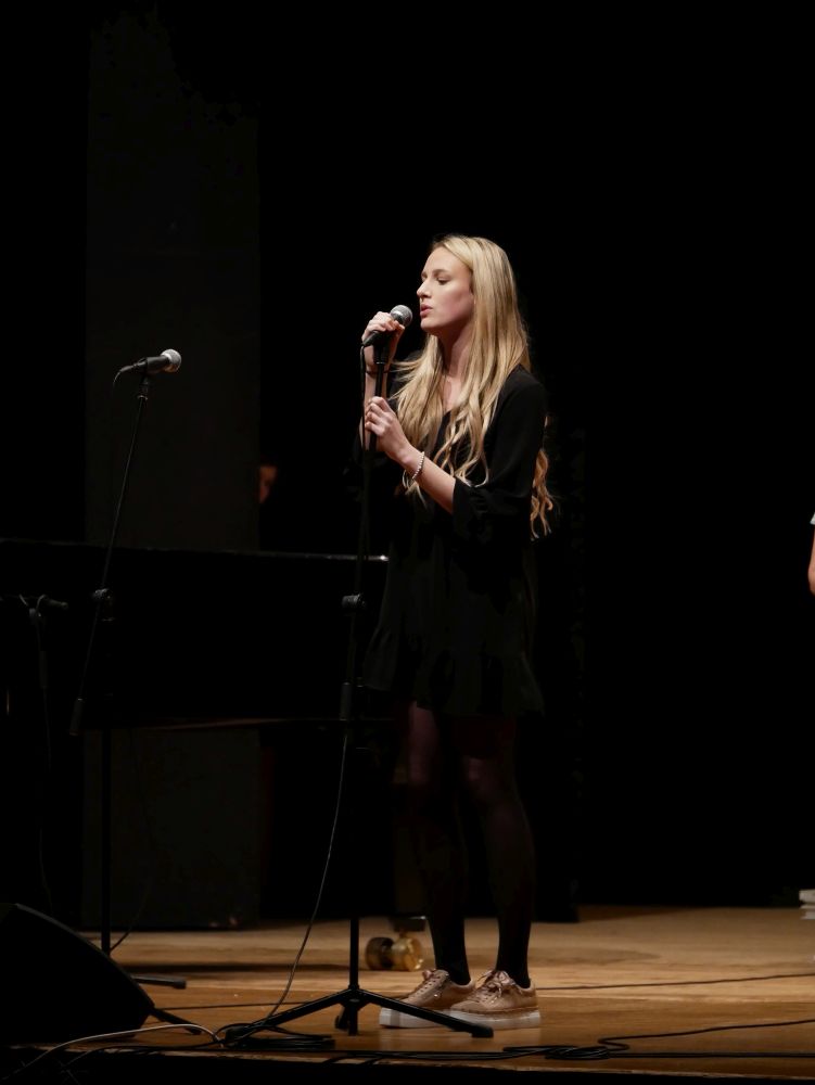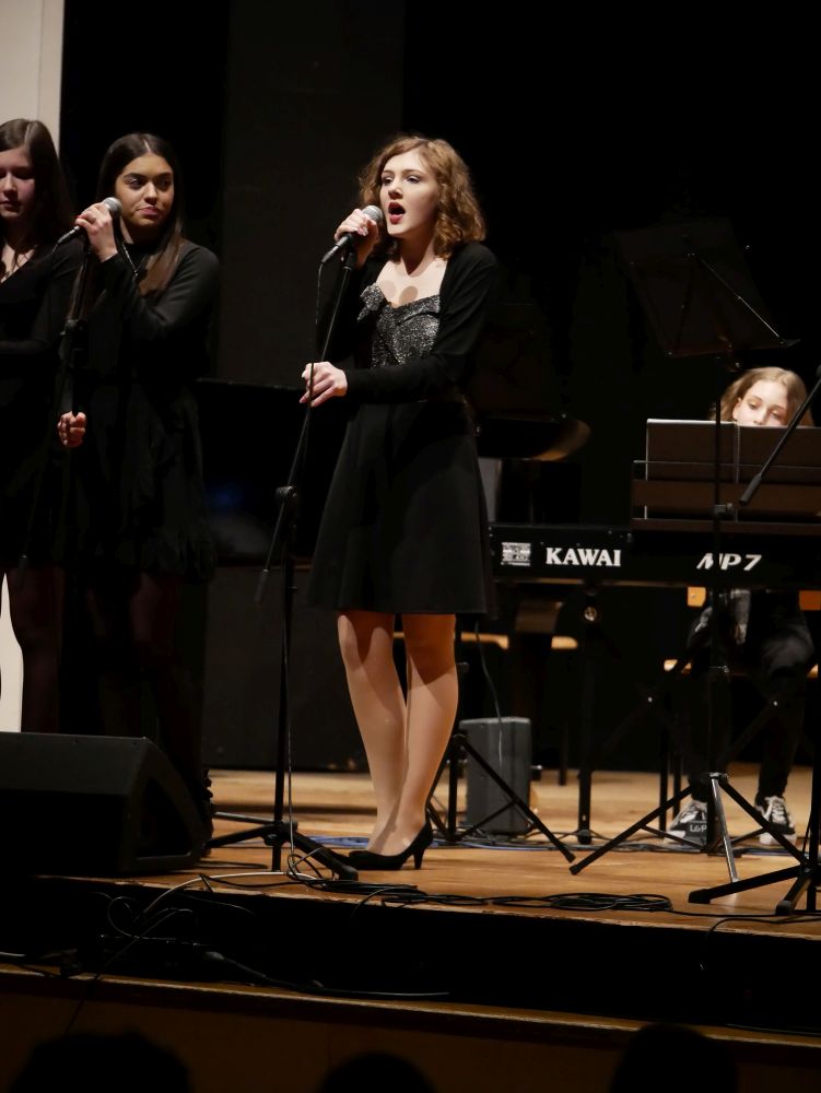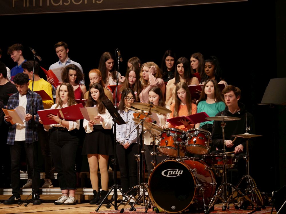 Nach der Pause empfing der Chor der Klassen 8-13 das Publikum mit dem Medley „Who wrote the book of love?". Mit zahlreichen Solos untermalten die Schülerinnen und Schüler ihre Gesamtperformance musikalisch stark. Beide Chöre wurden gekonnt von Herrn Schlatter am Flügel und Lars Grewenig am Schlagzeug begleitet.