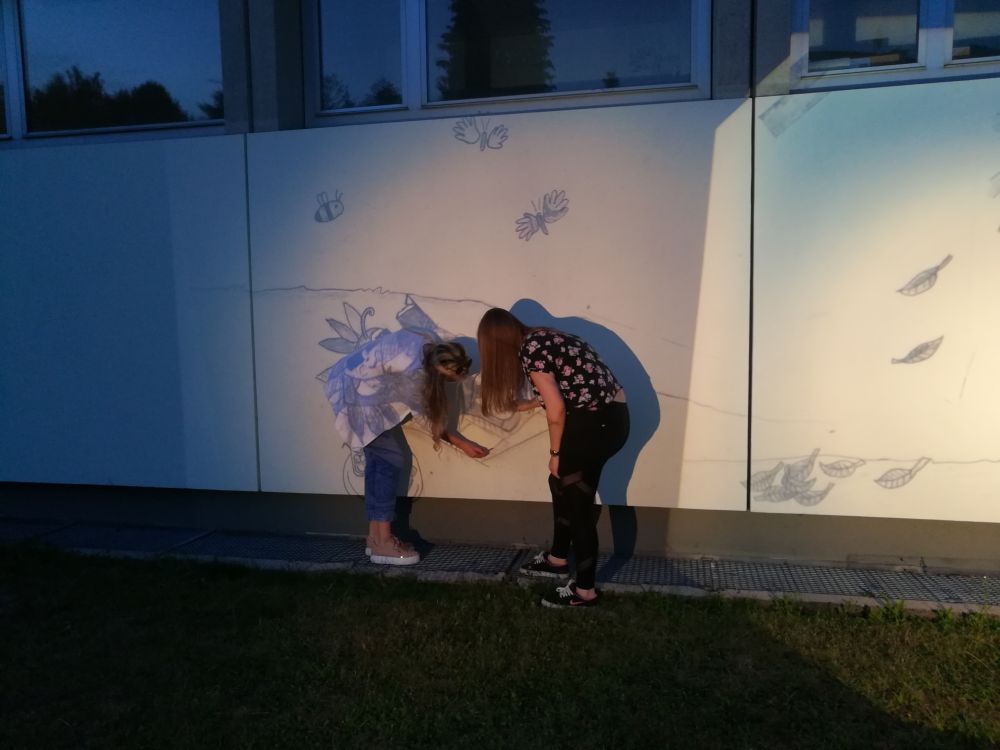 Bereits zuvor planten und fertigten wir Schüler einen Entwurf für die Fassade an, nachdem uns Frau Schilling von der Nachfrage der Kita- Leitung erzählte. Nach der Präsentation des Entwurfes und der Einwilligung der Kita – Leitung stand der Weg frei für die Umsetzung. Jedoch verzögerte sich diese aufgrund der Schulschließungen und des Homeschooling. In der letzten Schulwoche war es dann schließlich soweit. Samstag abends warfen wir den Entwurf per Overhead-Projektor an die Fassade, um die Umrisse abzuzeichnen. In den folgenden zwei Wochen bemalten wir die Fassade innerhalb von vier Arbeitstagen. Die Umsetzung hat uns viel Freude bereitet aber noch schöner waren die Reaktionen der Erzieherinnen und der Kinder.
