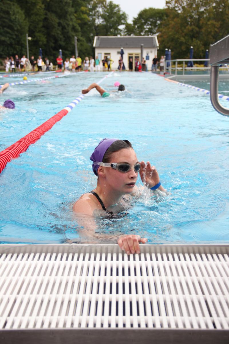 Topmotiviert, in diesem Jahr ihre sehr gute Vorjahresleistung (Platz 2 in ihrer Altersklasse) zu übertreffen, wurde sich bereits schon vor den Ferien und in den Ferien auf die einzelnen Disziplinen gut vorbereitet. Die erst 15-jährige Vanessa Schultz brachte mit einer sehr guten Schwimmleistung über die 1000 m ihre Teamkolleginnen gut ins Rennen. Trotz widriger Umstände auf der teils schwierigen Mountainbikestrecke, die dem einsetzenden Regen zuzuschreiben waren, trat Dorothee Hemmer kräftig in die Pedale und zeigte, dass sich auch ihr Training in den Ferien bezahlt gemacht hat. Der Wechsel auf Sina Kettering verlief reibungslos. Zu laufen waren drei Runden am Eisweiher. Bereits in der ersten Runde versetzte eine Verletzung von Sina der Mannschaft einen Schock. Unglücklich knickte sie um und konnte das Rennen nicht zu Ende laufen. Eine Wertung und somit der Sprung aufs Treppchen blieb somit leider aus. An dieser Stelle möchte ich mich für den motivierten Einsatz der Schülerinnen bedanken und wünsche Sina gute Besserung.
