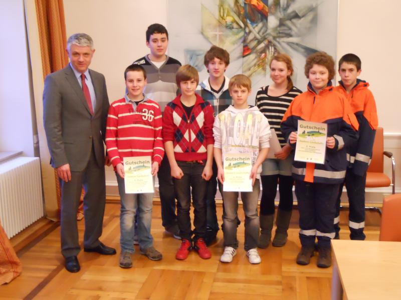 Nach Auswertung aller Fragebögen stand fest, dass alle unsere teilnehmenden 7. Klassen unter den Preisträgern sind. Am 01.12.11 fand nun im Ratssaal der Stadt Pirmasens die Preisverleihung an Schülervertreter der erfolgreichen Klassen durch Herrn Oberbürgermeister Dr. Matheis statt. Die Klasse 7a belegte den 1. Platz. Sie wird gemeinsam mit ihrer Biologie-Lehrerin, Frau Hoock, eine Fahrt zur Waldweihnacht nach Johanniskreuz unternehmen. Die Klassen 7b und 7c belegten gemeinsam den 3. Platz. Sie werden mit Frau Klimmer-Fitting im kommenden Frühjahr jeweils eine Exkursion mit der Forstverwaltung im Pfälzerwald mit anschließendem Flammkuchenessen durchführen. Den zweiten Platz belegte die Jugendfeuerwehr Pirmasens.
