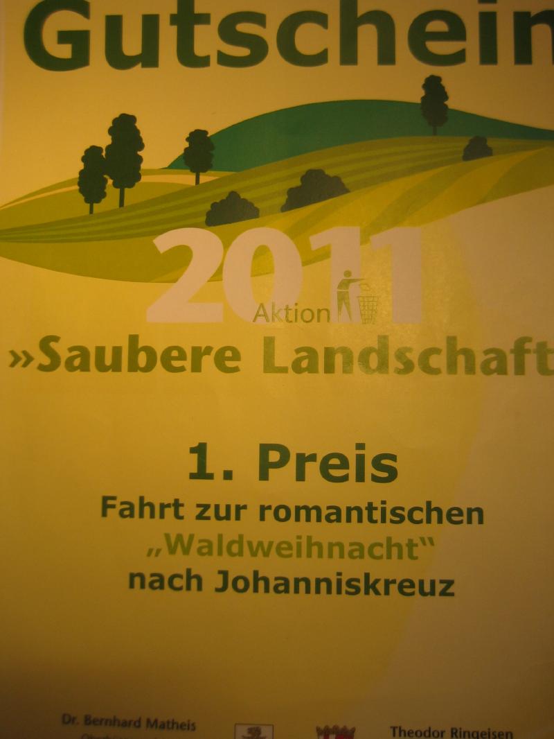 Wie bereits berichtet, erreichte die Klasse 7a beim Preisrätsel "Wald und Abfallentsorgung" den 1. Preis und durfte am Samstag, den 10.12.11 zur romantischen Waldweihnacht nach Johanniskreuz fahren. Bei kühlem, aber sonnigem Wetter konnten dort kleine Geschenke selbst angefertigt werden oder auch einiges aus dem breiten Spektrum regionaler Handwerkskunst erworben werden. Ein musikalisches Rahmenprogramm und die vielen Lichter sorgten für eine ganz besondere Adventsstimmung.