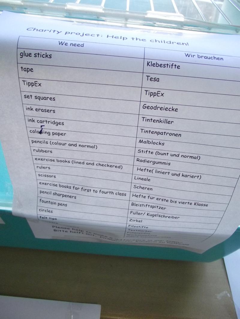 Im Rahmen eines Englisch-Projekts "Making a difference" startete die E2-Gruppe der 10a unter der Leitung von Frau Bech im Dezember die Vorbereitungen für ein Hilfsprojekt. Nun sollte das ganze Leibniz mithelfen! Im Eingangsbereich stand bis Mitte Februar ein Sammelkasten, in den jede(r) Schüler(in) Schulmaterial spenden konnte. Dazu hing eine Liste mit gesuchten Dingen aus. Die 10a wollte mit dieser Aktion zeigen, dass Kindern in Not jeder helfen kann, auch auf regionaler Ebene!