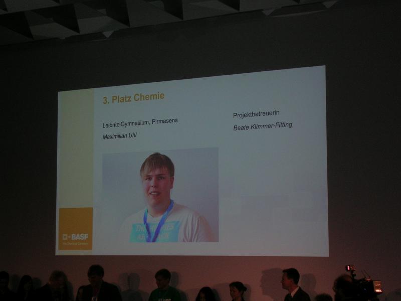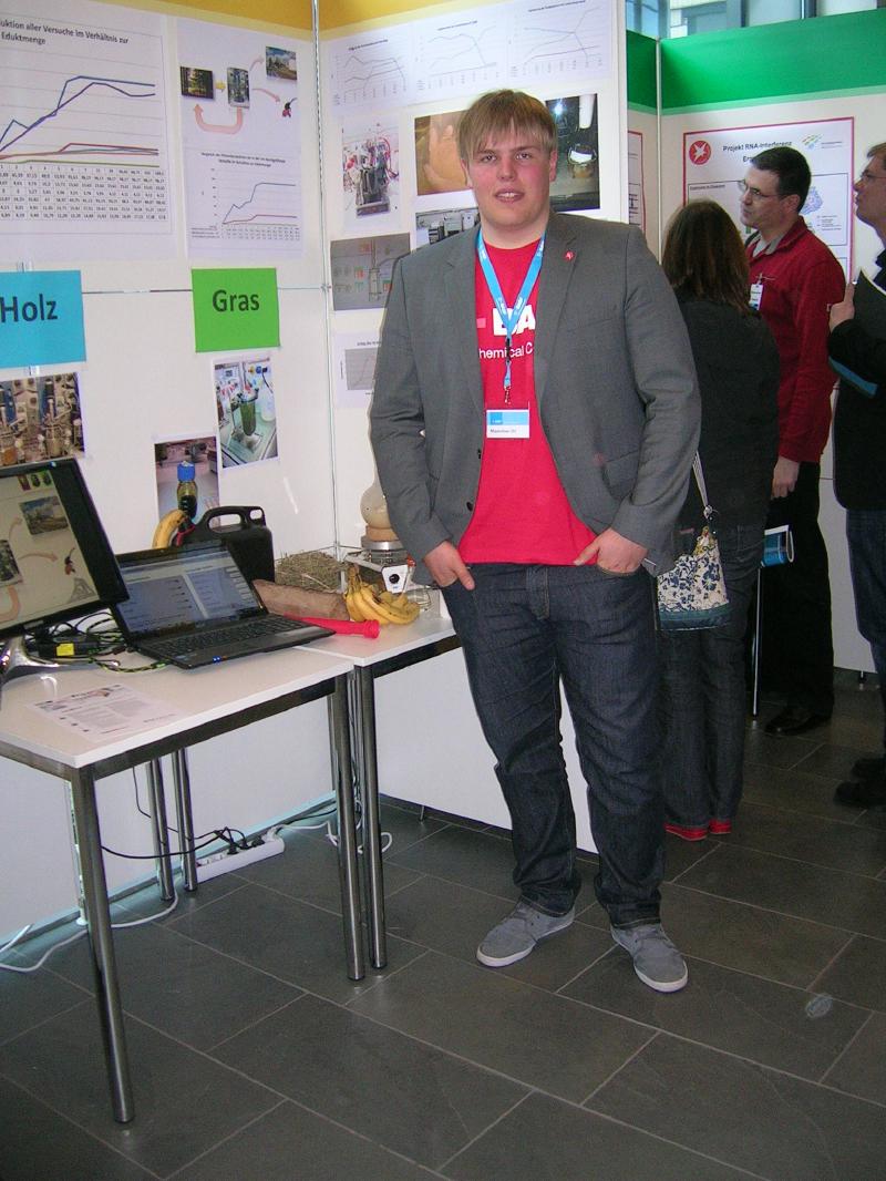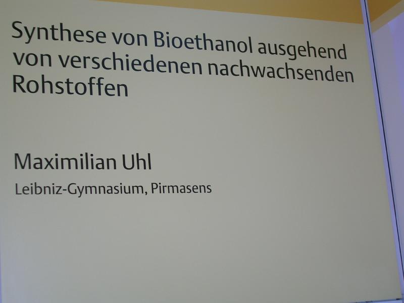 Maximilian Uhl, Abiturient 2012 des Leibniz Gymnasiums, nahm erfolgreich am Landesentscheid "Jugend forscht" in Ludwigshafen teil. Die dreitägige Veranstaltung fand in der BASF kurz vor den Osterferien statt. Maximilian Uhl erreichte trotz großer Konkurrenz einen hervorragenden dritten Platz mit dem aktuellen Thema: "Synthese von Bioethanol ausgehend von verschiedenen nachwachsenden Rohstoffen". Als Rohstoffe zur Herstellung des Alkohols verglich er die Effektivität von Holz, Grassilage und Bananen. Am zweiten Tag der Veranstaltung bekam er außerdem einen Sonderpreis für seine Forschung an alternativen Energiequellen. Wir gratulieren Maximilian Uhl zu seinem tollen Erfolg.