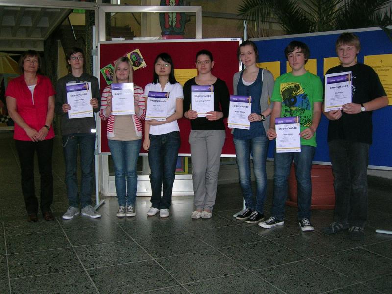 In diesen Tagen überreichten Schulleiter Dieter Kallenbach und die Wettbewerbsleiterin Elke Geßner die Urkunden an die Preisträger, die sich über sechs dritte und den zweiten Preis für Eric Bahne, Klasse 8 freuen durften.