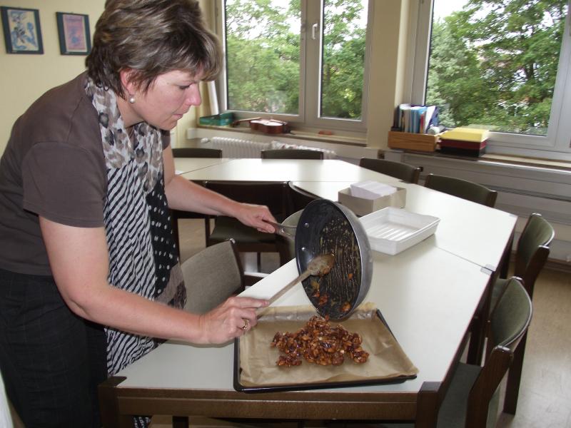 Am Mittwoch, den 20.06.12 und Donnerstag, den 21.06.12 kochten die Lateiner der Klasse 7b mit ihrer Lehrerin, Frau Gottert eine römische Mahlzeit. Am Tag zuvor bereitet Frau Gottert liebevoll die Speisen vor und am Mittwoch wurden Vorspeise und Hauptgang serviert. Die Vorspeise war ein Hähnchen- Gurken- Schichtsalat mit Balsamico- Essig- Honigdressing. Der Hauptgang war ein Schweinebraten mit Feigen und Aprikosen in Honigsoße. Jetzt mussten die Schüler es sich nur noch schmecken lassen. Am Donnerstag freuten sich alle auf den Nachtisch. In der Küche des Lehrerzimmers wurden Nüsse und Datteln in Honig karamellisiert. Anschließend teilte Frau Gottert die süße Masse in kleine Portiönchen auf. Diese wurden während eines Filmes über die römische Esskultur verspeist.