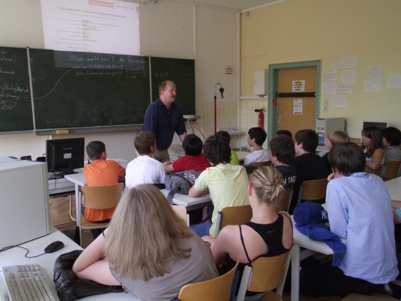 Im Rahmen des Jugendmedienschutzes an unserer Schule fand in der letzten Schulwoche vor den Sommerferien in allen 6. und 7. Klassen ein Projekt in Zusammenarbeit mit der Verbraucherzentrale Rheinland-Pfalz statt. Im Gespräch mit Herrn Reincke aus Kaiserslautern zeigte sich, dass unsere Schüler in diesem Themenbereich schon sehr fit sind, Vorsichtsmaßnahmen kennen und sich größtenteils sicher im Netz bewegen. Dass das Internet - wie alle Medien - positiv und negativ genutzt werden kann, wussten alle. Relativ neu war dagegen die Idee, auch gezielt "positive" Informationen über sich preiszugeben - das Internet also als Litfasssäule zu nutzen, um Reklame für sich zu machen. Dies ist beispielsweise sinnvoll, wenn man sich um ein Praktikum oder Stipendium bewirbt - dann könnte die eigene "vorteilhafte" Darstellung im Netz natürlich von großem Nutzen sein. Denn es ist ja nicht nur unter Arbeitgebern üblich, sich im Internet über Bewerber zu informieren....