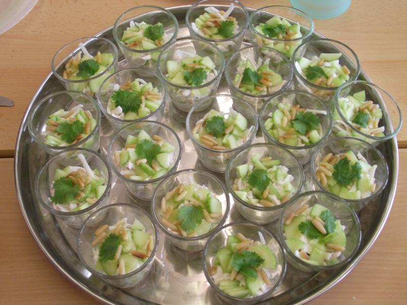 Am Mittwoch, den 20.06.12 und Donnerstag, den 21.06.12 kochten die Lateiner der Klasse 7b mit ihrer Lehrerin, Frau Gottert eine römische Mahlzeit. Am Tag zuvor bereitet Frau Gottert liebevoll die Speisen vor und am Mittwoch wurden Vorspeise und Hauptgang serviert. Die Vorspeise war ein Hähnchen- Gurken- Schichtsalat mit Balsamico- Essig- Honigdressing. Der Hauptgang war ein Schweinebraten mit Feigen und Aprikosen in Honigsoße. Jetzt mussten die Schüler es sich nur noch schmecken lassen. Am Donnerstag freuten sich alle auf den Nachtisch. In der Küche des Lehrerzimmers wurden Nüsse und Datteln in Honig karamellisiert. Anschließend teilte Frau Gottert die süße Masse in kleine Portiönchen auf. Diese wurden während eines Filmes über die römische Esskultur verspeist.