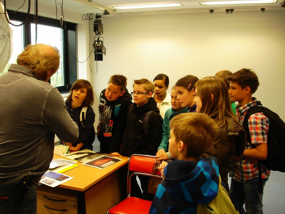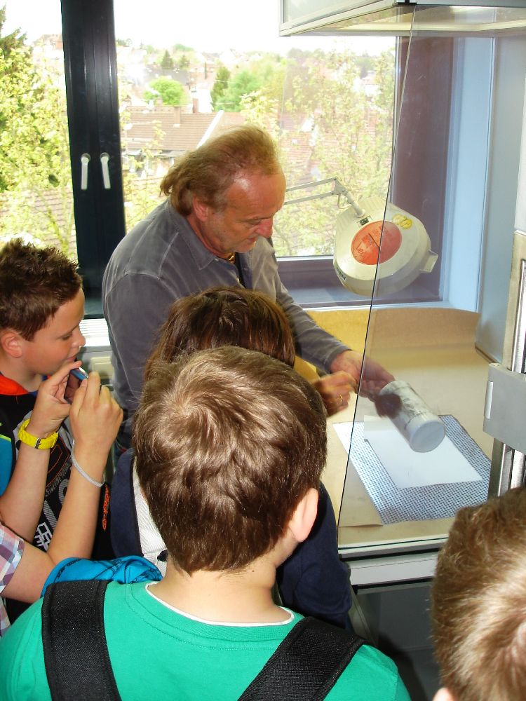 Dann gingen wir in den 6. Stock. Die andere Gruppe tauschte also mit uns. Als wir mit großer Mühe oben ankamen, kam uns Herr Emlich entgegen. Bei ihm lernten wir, wie man einen Finger- und Fußabdruck sichern kann. Wir sicherten die Fingerabdrücke zweier Schüler. Mit UV- Licht kann man unsichtbare Schriften sichtbar machen.
