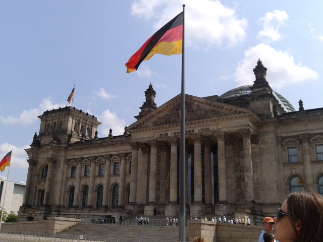 Durch die Kunstakademie gelangten wir auf den Pariser Platz, auf dem das Brandenburger Tor und das Hotel Adlon zu einem Fotostopp einluden. Nachdem die Fotos im Kasten waren, gingen wir weiter zum Reichstagsgebäude, wo wir etwas über dessen Geschichte erfuhren.