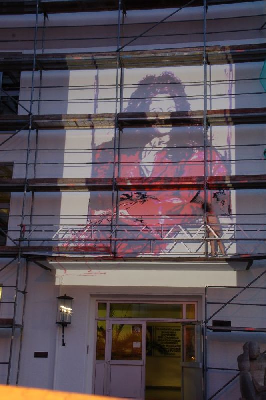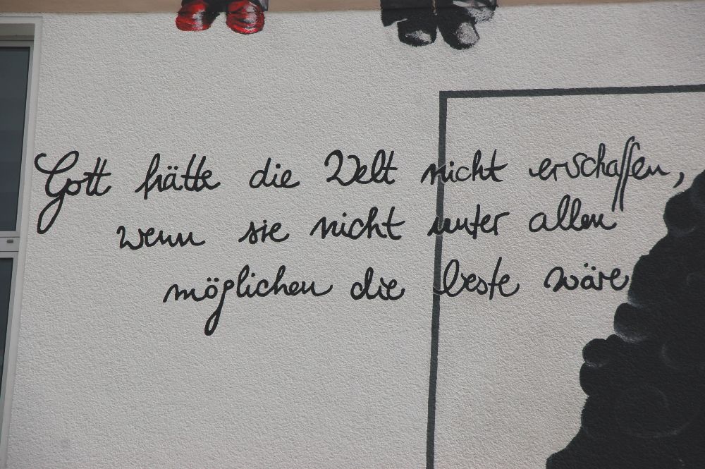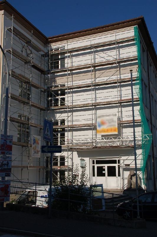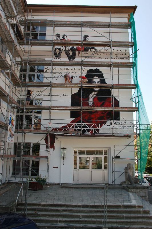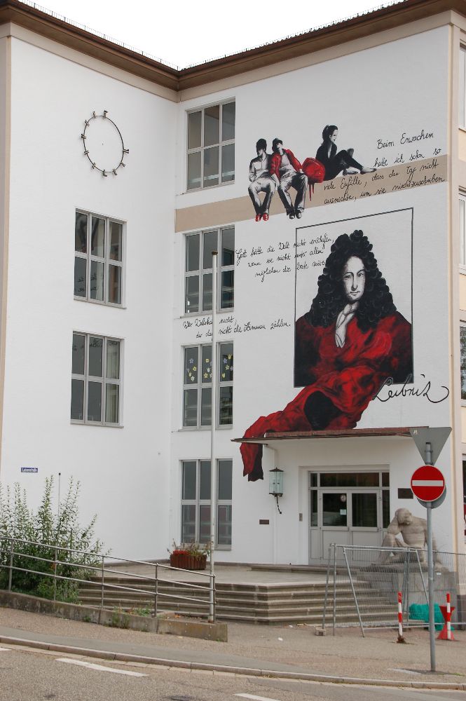 Zu Beginn der Sommerferien kündete ein Gerüst von einem neuen Blickfang für das Leibniz: Von der Künstlerin Marie Gouil wurde die Fassade im Bereich des Eingangs durch ein riesiges Gemälde zu einem weithin sichtbaren Anziehungspunkt. Frau Gouil ist an unserer Schule als Lehrerin für Bildende Kunst tätig und hat u.a. in Kaiserslautern schon ähnliche Fassaden gestaltet. Auf Anfrage war sie direkt bereit, auch das "Leibniz" mit ihrer Kunst zu verschönern. Die Stadt Pirmasens konnte für das Projekt gewonnen werden und steuerte Gerüst und Farbe bei.