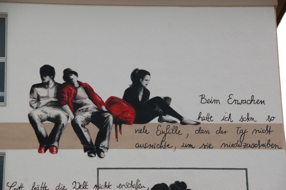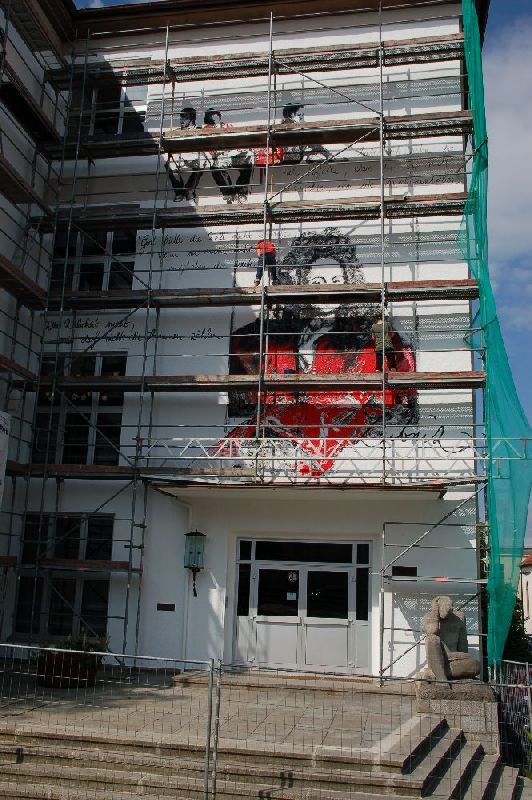 Zentrales Objekt ist (natürlich) das Porträt des Namensgebers der Schule, von dem auch die Zitate an der Wand stammen. Die Vorlage der Künstlerin wurde mit Hilfe eines starken Beamers in zwei Nachtschichten an die Wand übertragen und dort in akribischer Kleinarbeit ausgestaltet. Die Feinarbeit übernahm reine "Frauenpower" auf dem Gerüst - die Künstlerin wurde unermüdlich unterstützt von Kolleginnen (Frau Breum, Frau Schilling, Frau Schmitt, Frau Weilbach-Pieters) und Freundinnen.