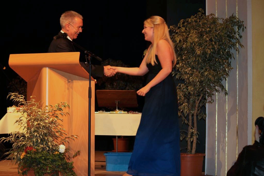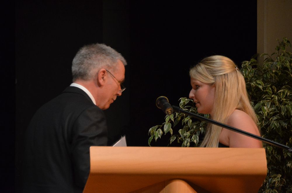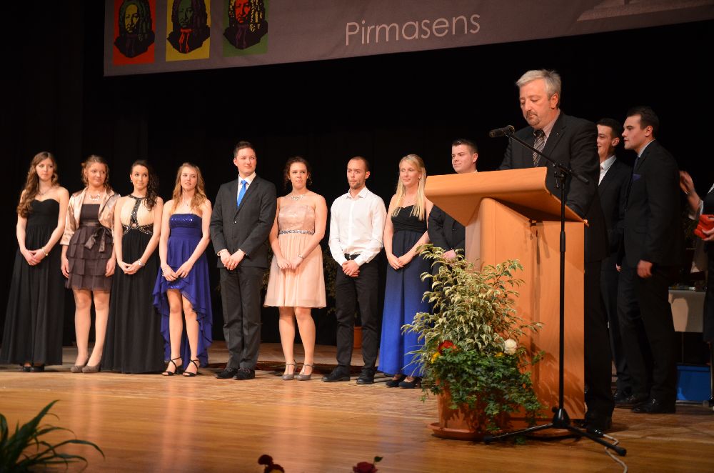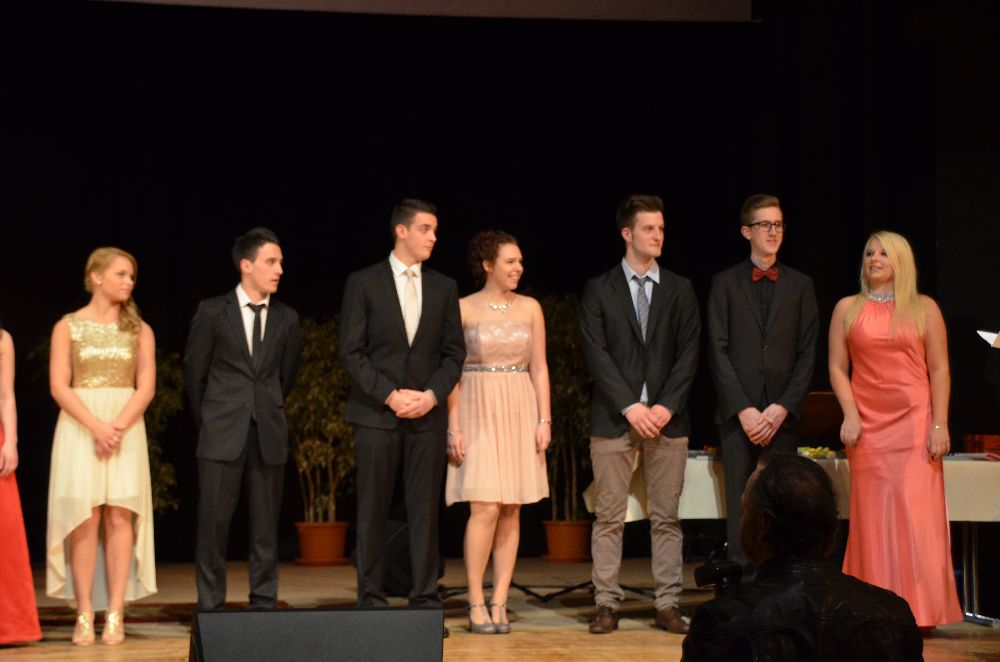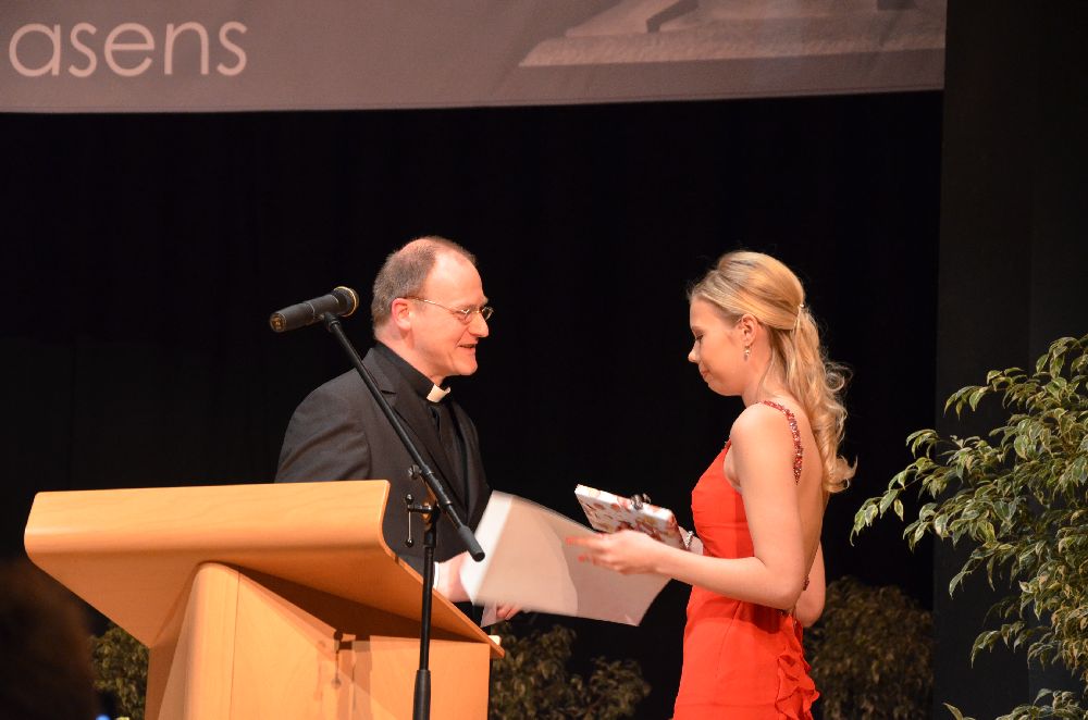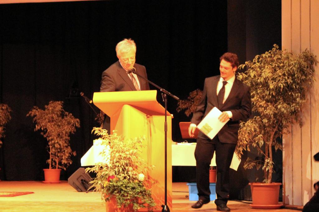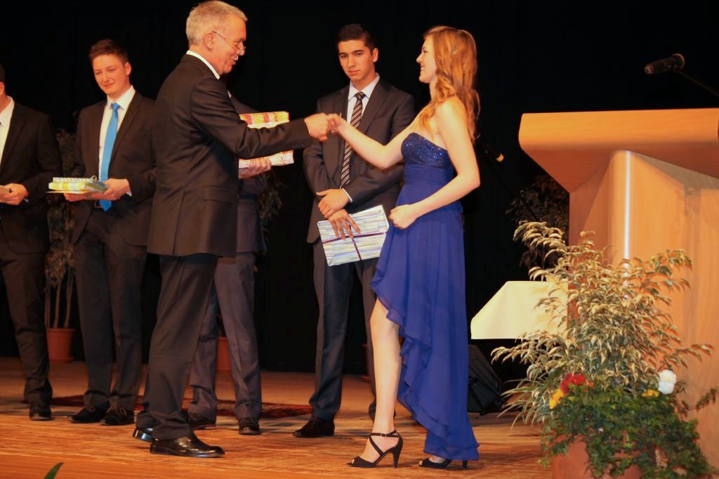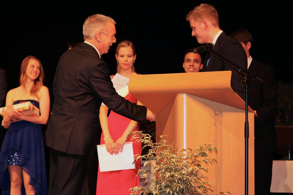 Nach einem Klavierstück, dargebracht vom Slodki-Preisträger Philipp Cölsch, begrüßten Niclas Ludy und Lars Ruprecht die Schulgemeinschaft. Die Ansprache des Schulleiters Herrn Kallenbach schloss ein weiteres Klavierstück von David Ranzinger ab. Nach der Zeugnisausgabe gab es wieder viele Preise zu vergeben, die dieses Jahr an 15 Schülerinnen und Schüler der Jahrgangsstufe überreicht werden konnten. Vertreter der Stadt, der Kirchen, des Schulelternbeirats, des Fördervereins und der Firma Convar übergaben persönlich die von ihnen gestifteten Preise. Den Abschluss des offiziellen Teils bildeten die sehr persönlichen und teils auch nachdenklichen Abschiedsworte der Abiturienten (Lisa Jennewein und Philipp Cölsch), bevor Kevin Klar und David Ranzinger musikalisch die Zuhörer an das Buffet entließen. Im inoffiziellen Teil zeigte die Jahrgangsstufe noch einmal ihr breites Können - von Pop- über Rapmusik, Tanzeinlagen bis zum abschließenden Männerballett wurde Unterhaltung geboten.