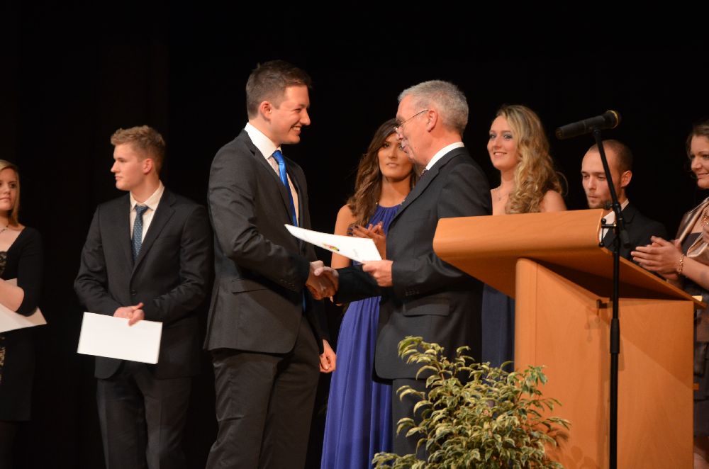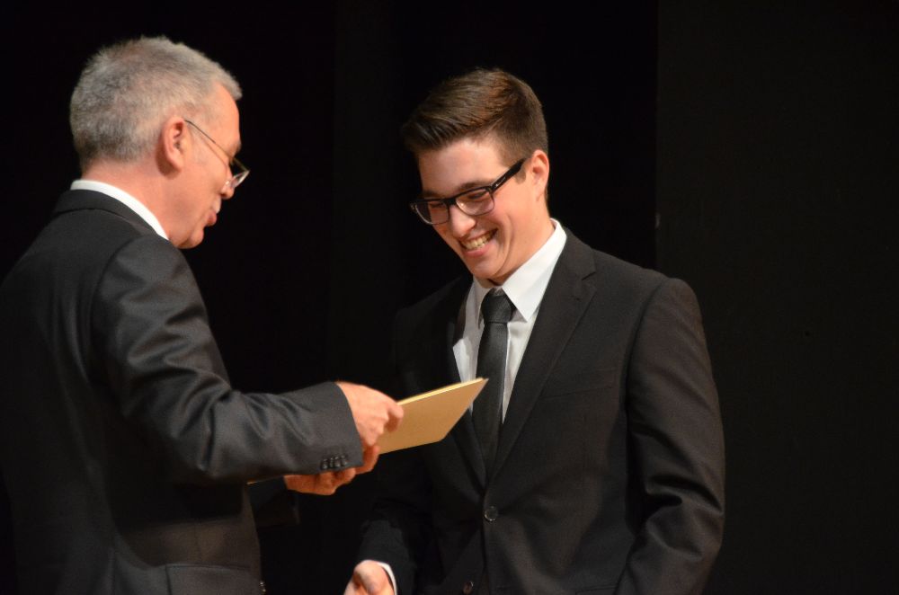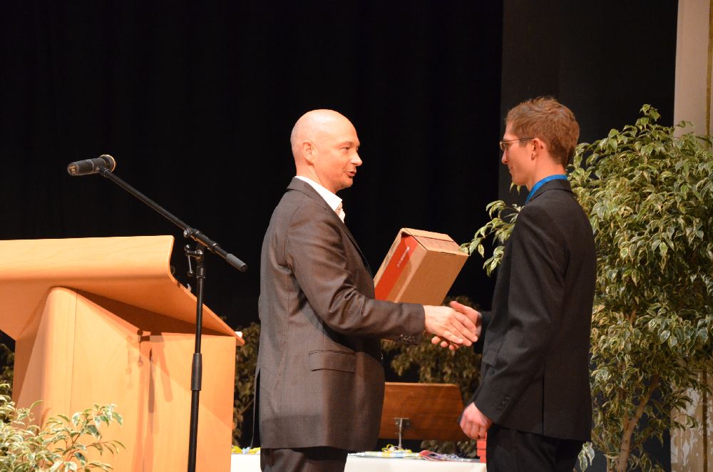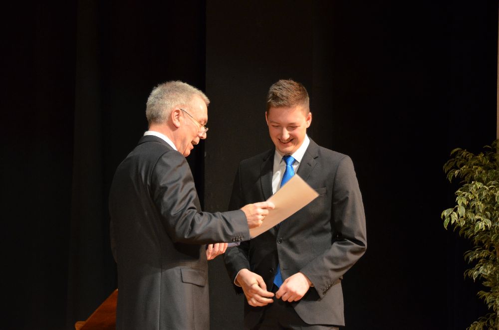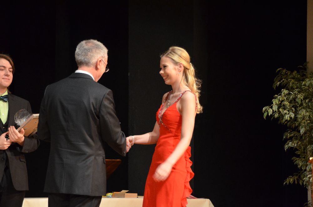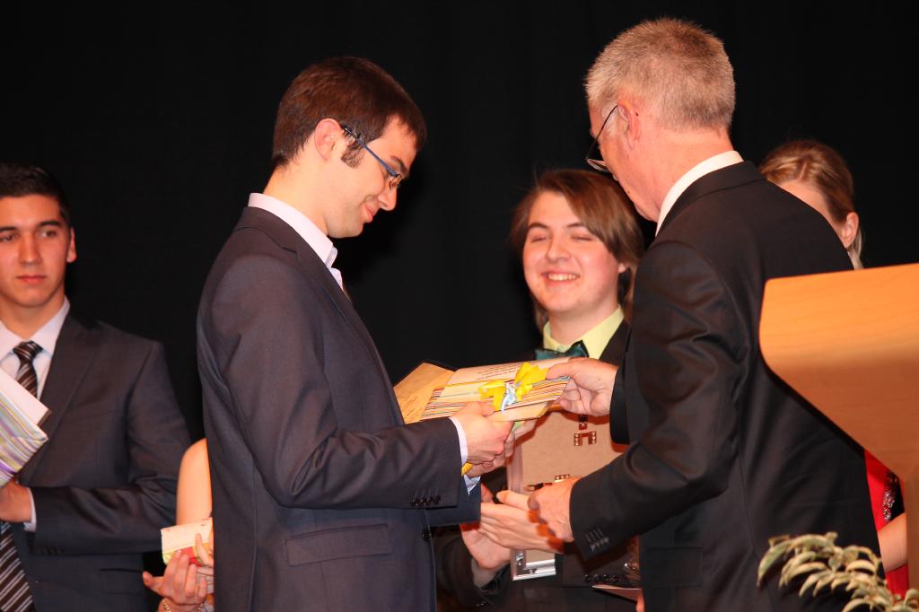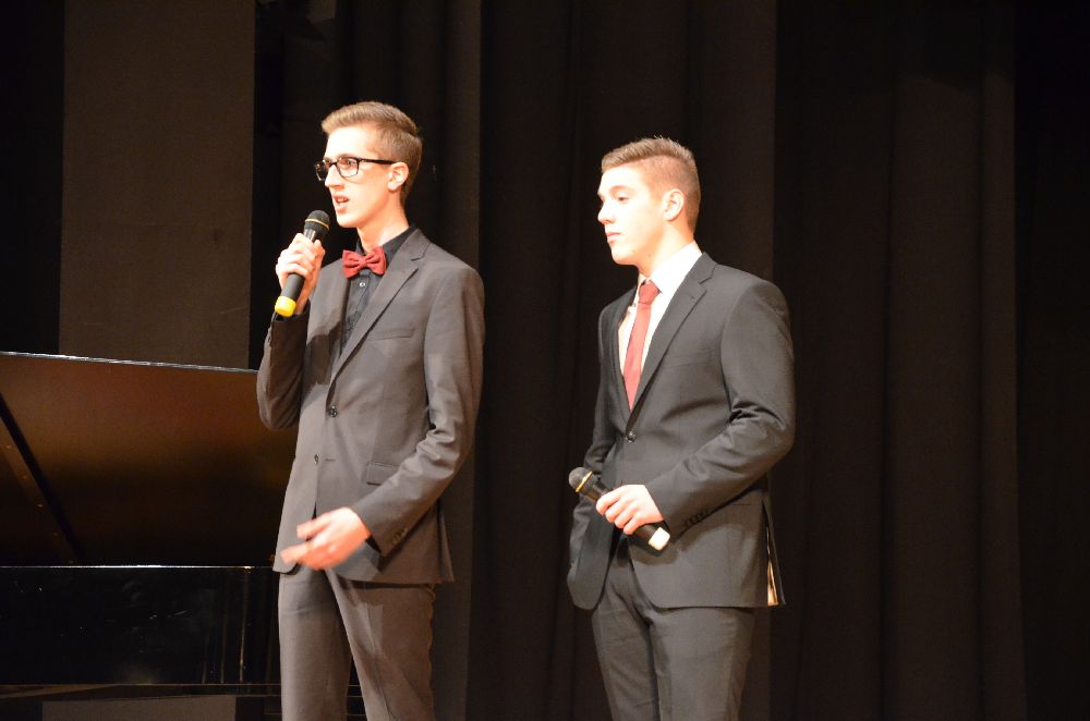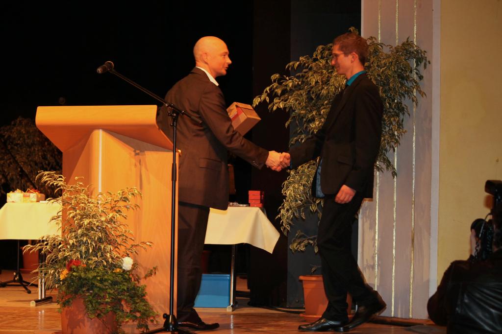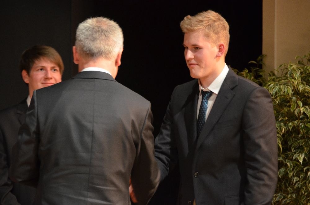 Nach einem Klavierstück, dargebracht vom Slodki-Preisträger Philipp Cölsch, begrüßten Niclas Ludy und Lars Ruprecht die Schulgemeinschaft. Die Ansprache des Schulleiters Herrn Kallenbach schloss ein weiteres Klavierstück von David Ranzinger ab. Nach der Zeugnisausgabe gab es wieder viele Preise zu vergeben, die dieses Jahr an 15 Schülerinnen und Schüler der Jahrgangsstufe überreicht werden konnten. Vertreter der Stadt, der Kirchen, des Schulelternbeirats, des Fördervereins und der Firma Convar übergaben persönlich die von ihnen gestifteten Preise. Den Abschluss des offiziellen Teils bildeten die sehr persönlichen und teils auch nachdenklichen Abschiedsworte der Abiturienten (Lisa Jennewein und Philipp Cölsch), bevor Kevin Klar und David Ranzinger musikalisch die Zuhörer an das Buffet entließen. Im inoffiziellen Teil zeigte die Jahrgangsstufe noch einmal ihr breites Können - von Pop- über Rapmusik, Tanzeinlagen bis zum abschließenden Männerballett wurde Unterhaltung geboten.