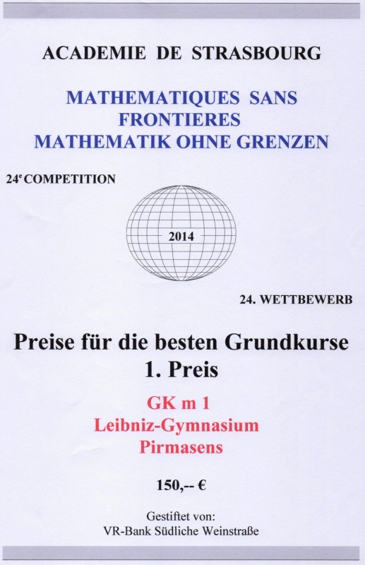 Am 11. März nahmen die Klassenstufen 10 und 11 aller Gymnasien der Süd-Südwestpfalz und des französischen Elsass sowie die Internationale Schule in Brüssel am Mathematikwettbewerb "Mathematik ohne Grenzen" teil. Der Mathematik Leistungskurs von Frau Laux sowie der Mathematik Grundkurs von Herr Jessl wurden anschließend zur Preisverleihung am 6. Mai nach Wörth eingeladen.