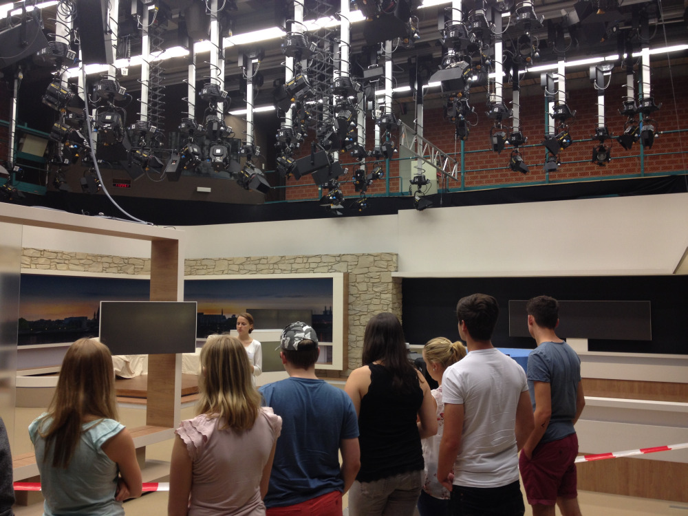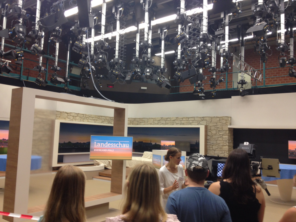 Bei der politischen Exkursion stand zunächst jedoch die „vierte Gewalt" im Vordergrund: Am Vormittag besichtigten die Schüler das Funkhaus des SWR, wo sie nach einer kurzen Präsentation über die Arbeit des Südwestrundfunk durch das Fernsehstudio der Landesschau und das Hörfunkstudio des Radiosenders SWR1 geführt wurden. Dort konnte man Moderator Detlef Budig über die Schulter schauen, während er u. a. Eilmeldungen über Falschfahrer verlas und die Nachrichten anmoderierte. Außerdem erzählte er viel Wissenswertes über den Beruf des Radiomoderators.
