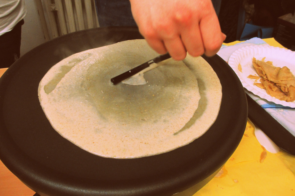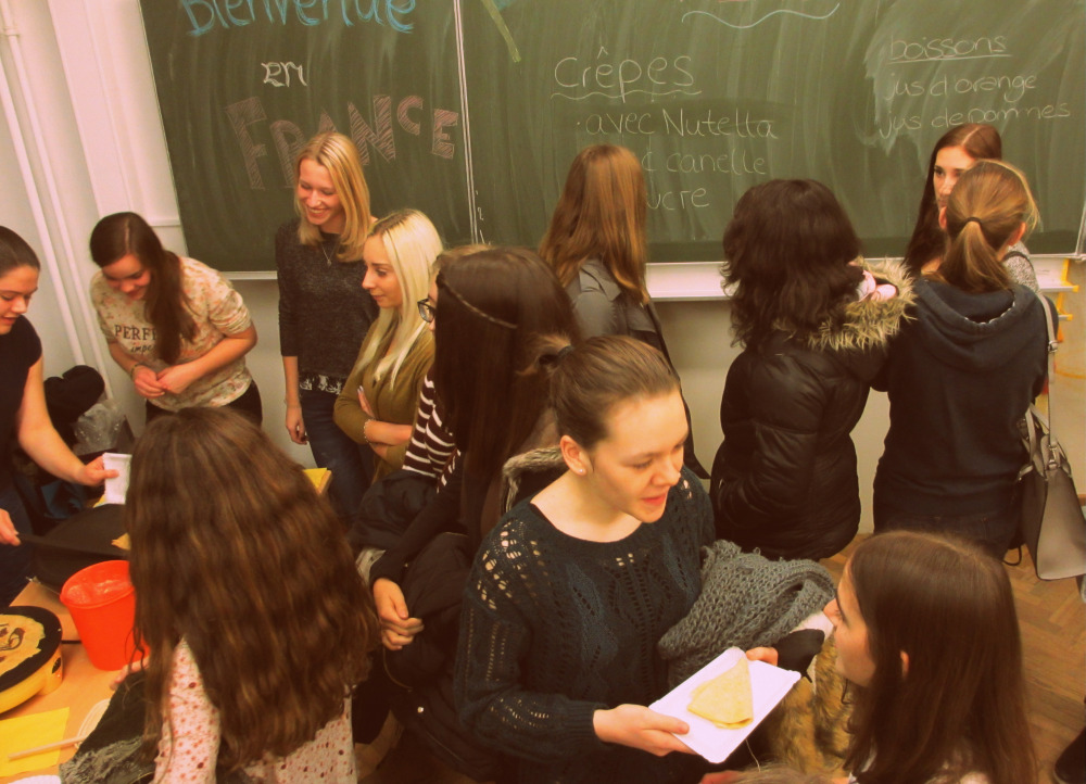 Die Filmvorführung begann nach einer kurzen offiziellen Begrüßung durch Herrn Günther-Spohr und Frau Schmalenbach gegen 19 Uhr, sodass nach einer Stunde eine 10-minütige Pause eingelegt werden konnte. In dieser wurden die restlichen Teigreserven in Crêpes verwandelt und die Schüler konnten gestärkt die letzten 45 Minuten des Films verfolgen.