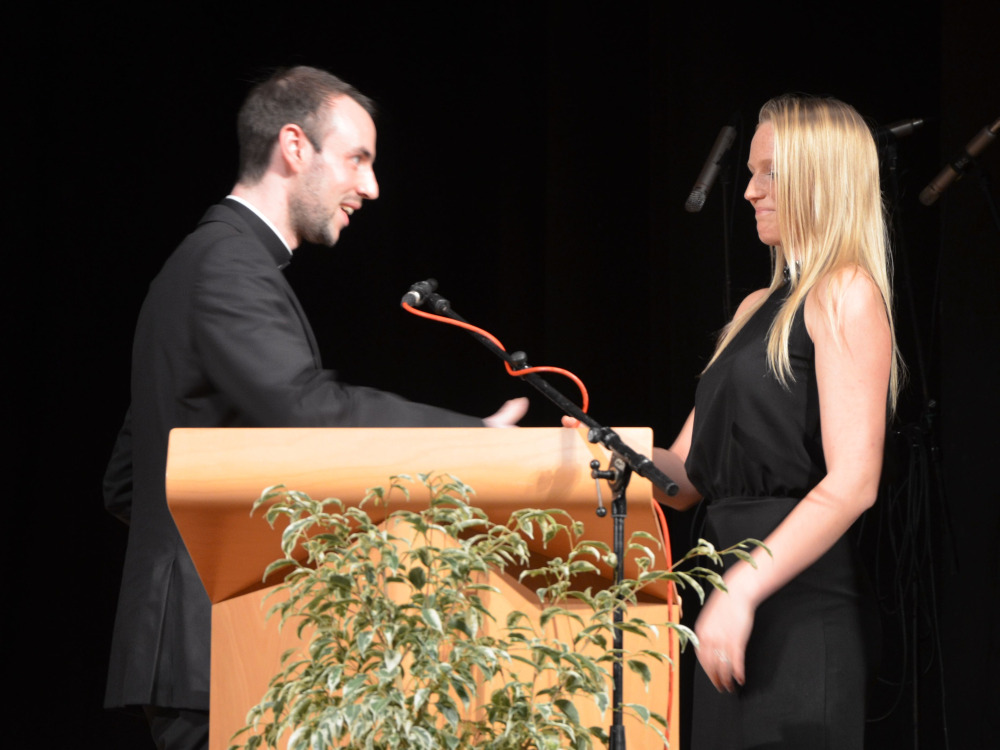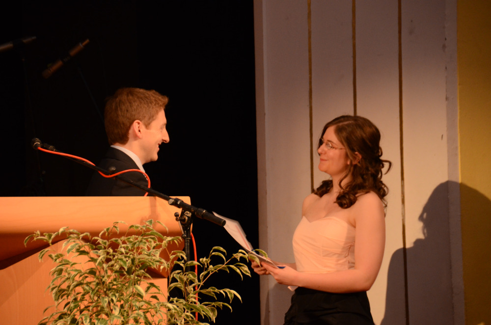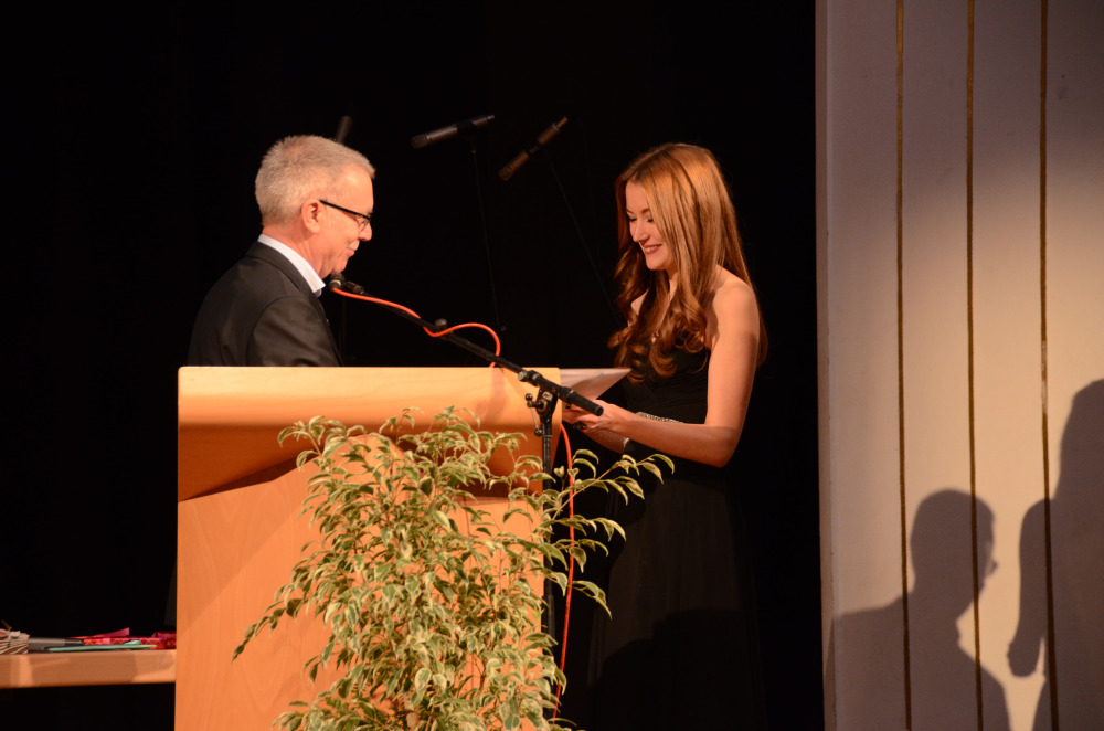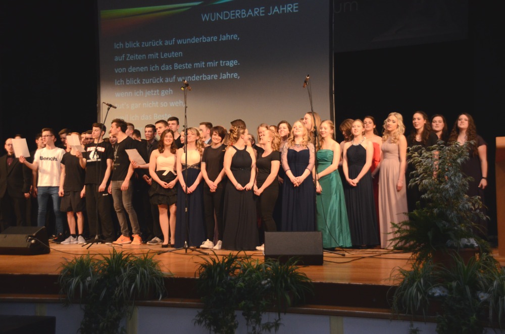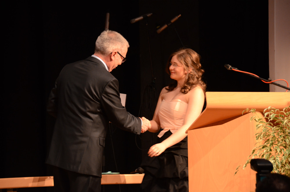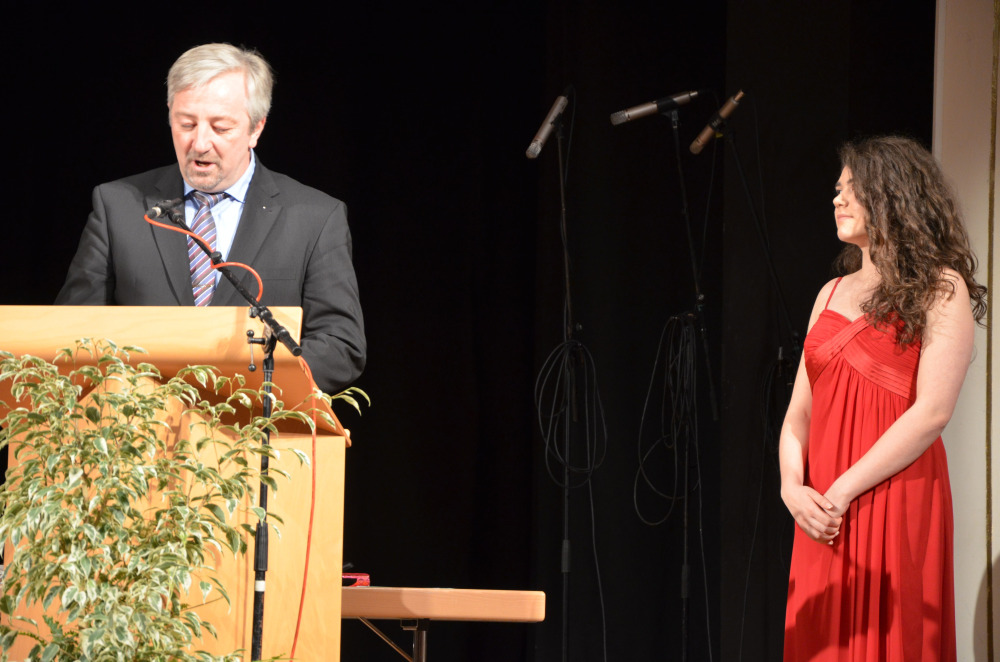 Nach einem Klavier-Intermezzo von Carolin Cölsch folgte die Rede der Abiturienten, gehalten von Elisabeth Amberger und Christoph Braun. Abschnittsweise ließen sie den Werdegang des Jahrgangs von der 5. bis zur 13. Stufe in chronologisch raschen Schritten anekdotisch und mit viel Selbstironie Revue passieren. Den Auftakt zur Verleihung der Abiturzeugnisse bildete ein stimmungsvoll gesungenes Hit-Medley von Julia Frank, begleitet von Jan Hemmer am E-Piano.