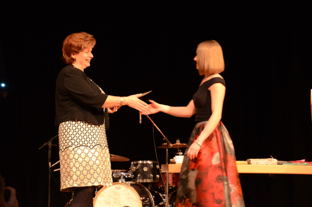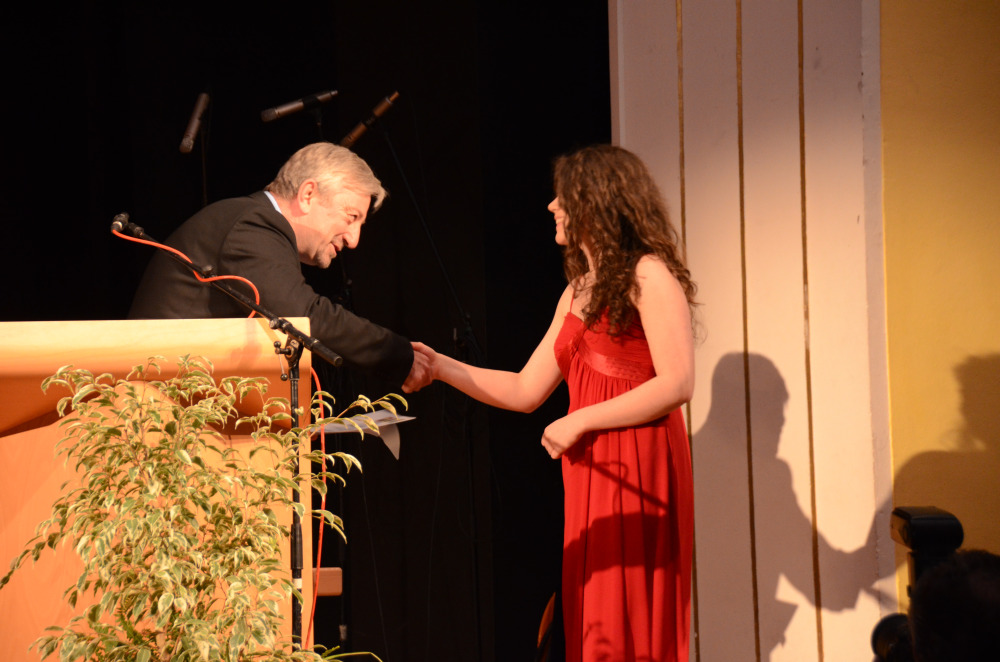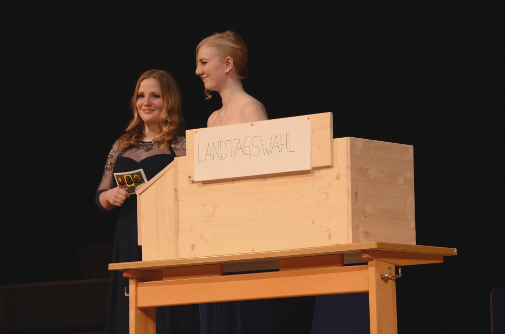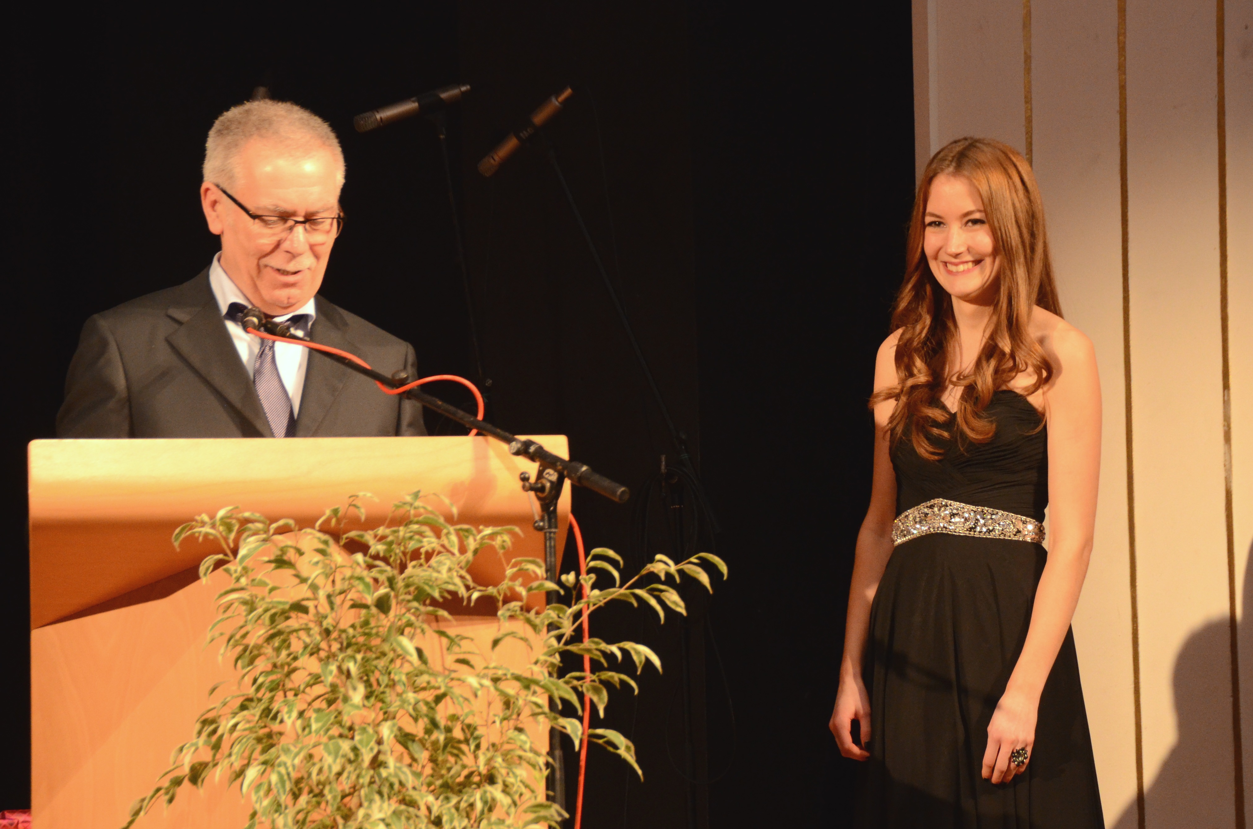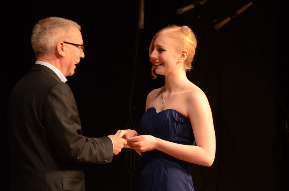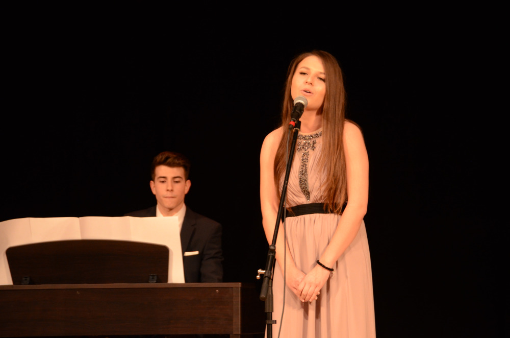 Nach einem Klavier-Intermezzo von Carolin Cölsch folgte die Rede der Abiturienten, gehalten von Elisabeth Amberger und Christoph Braun. Abschnittsweise ließen sie den Werdegang des Jahrgangs von der 5. bis zur 13. Stufe in chronologisch raschen Schritten anekdotisch und mit viel Selbstironie Revue passieren. Den Auftakt zur Verleihung der Abiturzeugnisse bildete ein stimmungsvoll gesungenes Hit-Medley von Julia Frank, begleitet von Jan Hemmer am E-Piano.