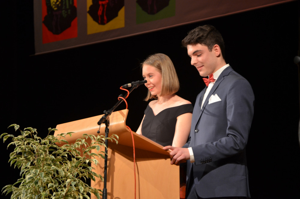 Die Abiturienten verabschiedeten sich am Freitagabend mit einer unterhaltsamen und kurzweiligen Feier von der Schulgemeinschaft. Den feierlichen Verlauf moderierten im paarweisen Wechsel Rebecca Wolfer und Johannes Scheerer sowie Lisa Marie Füger und Jan Ruprecht. Humorvoll und kurzweilig leiteten sie von der Begrüßung durch die Programmpunkte des Abends bis zu den Abschlussworten.