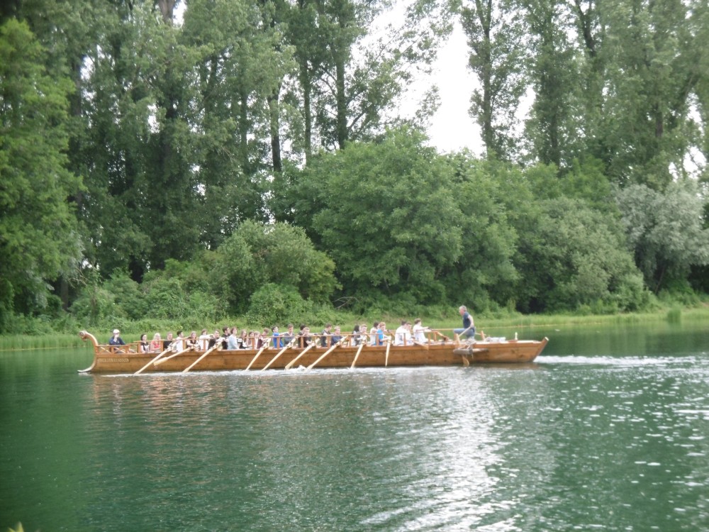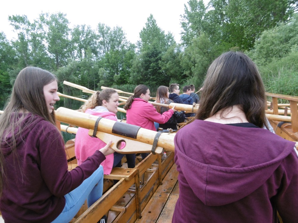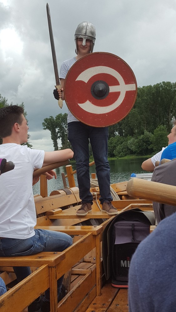 Danach machten wir alle zusammen eine Pause im Anglerheim in Neupotz. Dort gab es leckeres Essen und wir tauschen uns über die verschiedenen Themen aus. Daraufhin ging es dann auch für uns an Bord der Lusoria. Zuerst wurden uns verschiedene Regeln und Ruderarten erklärt. Wir konnten diese auch gleich selbst ausprobieren. Während der doch recht anstrengenden Bootsfahrt wurden verschiedene Herausforderungen an uns gestellt. Zwei Beispiele dafür sind die Fahrt mit verbundenen Augen und das Läuten einer Glocke mithilfe einer Stange, die einer der Betreuer in der Hand hielt. Dort haben wir viel über die Geschichte des römischen Militärs, vor allem der Römerboote und deren Besatzung gelernt.