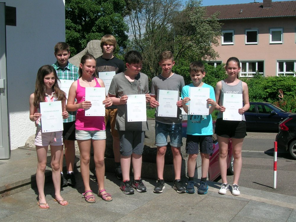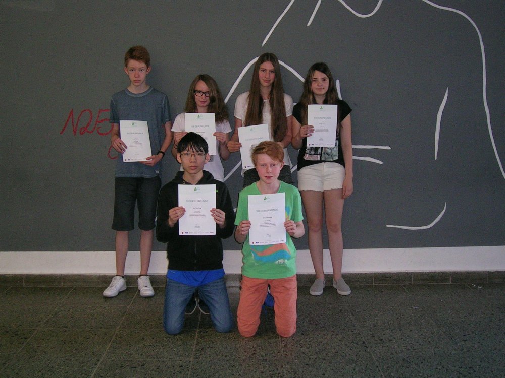 Melissa Eder, Philipp Ewen, Jonathan Freyer, Jule Grewenig, Carolin Guth, Hannah Hoffmann, Isabelle Klein, Rebecca Rohr, Nicole Roos, Lara Schäfer, Raquelle Sutter, Lea Timpe, Michelle Wanner, Louisa Wüstemann (Siegerurkunden). Ehrenurkunden erhielten Michael Graf, Mai-ko Halbig, Hannah Hof, Luc Schmitt und Benjamin Wolfer. Klasse 8b: Max Heringer, Emilie Kern, Claudia Konkel, Lars Müller, An Ton That. - Klasse 8d: