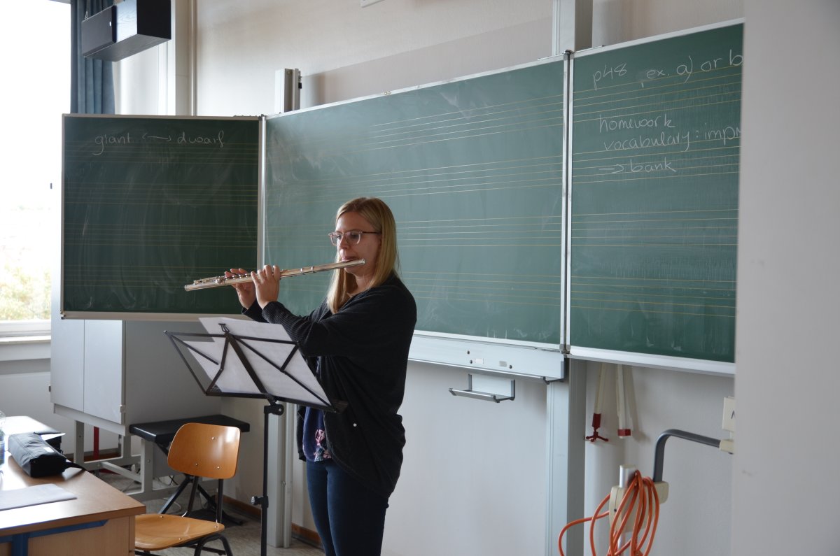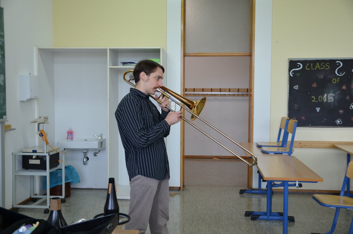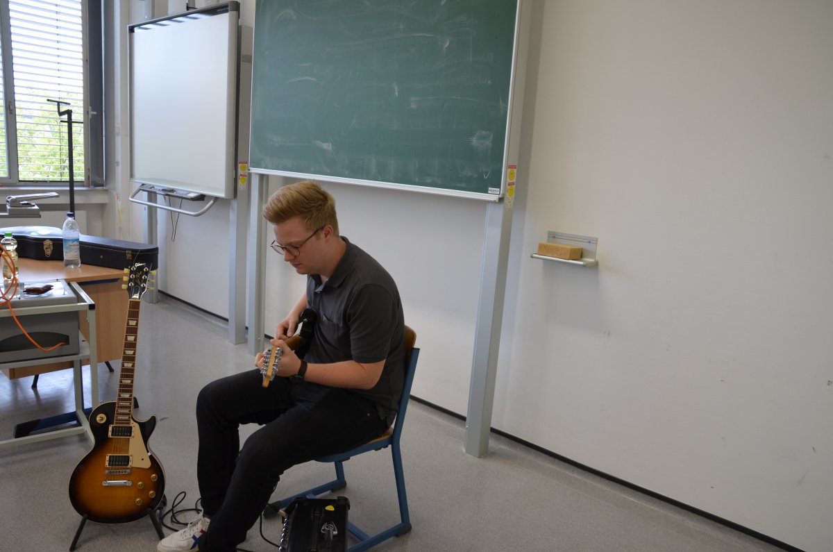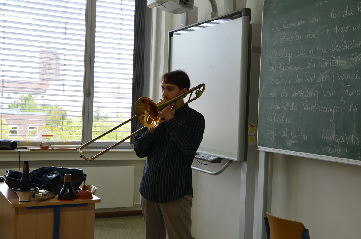 Livevorspiele, Hörbeispiele und Playbacks von CD, Gummiabflussreiniger („Klopömpel") als Dämpfer, Ratespiele, ... - die Lehrenden der Kreismusikschule Herr Jung, Herr Lerch, Frau Resch und Frau Wagner sowie die ehemaligen Schüler Moritz Preiß und Moritz Vogel hatten sich viel ausgedacht, um ihre Instrumente schmackhaft zu machen. Und das ist ihnen gelungen. Die Schülerinnen und Schüler der Klasse 5 hatten sichtlich Spaß und im Anschluss teilweise Schwierigkeiten, ihre Wunschlisten auf drei Instrumente zu begrenzen.
