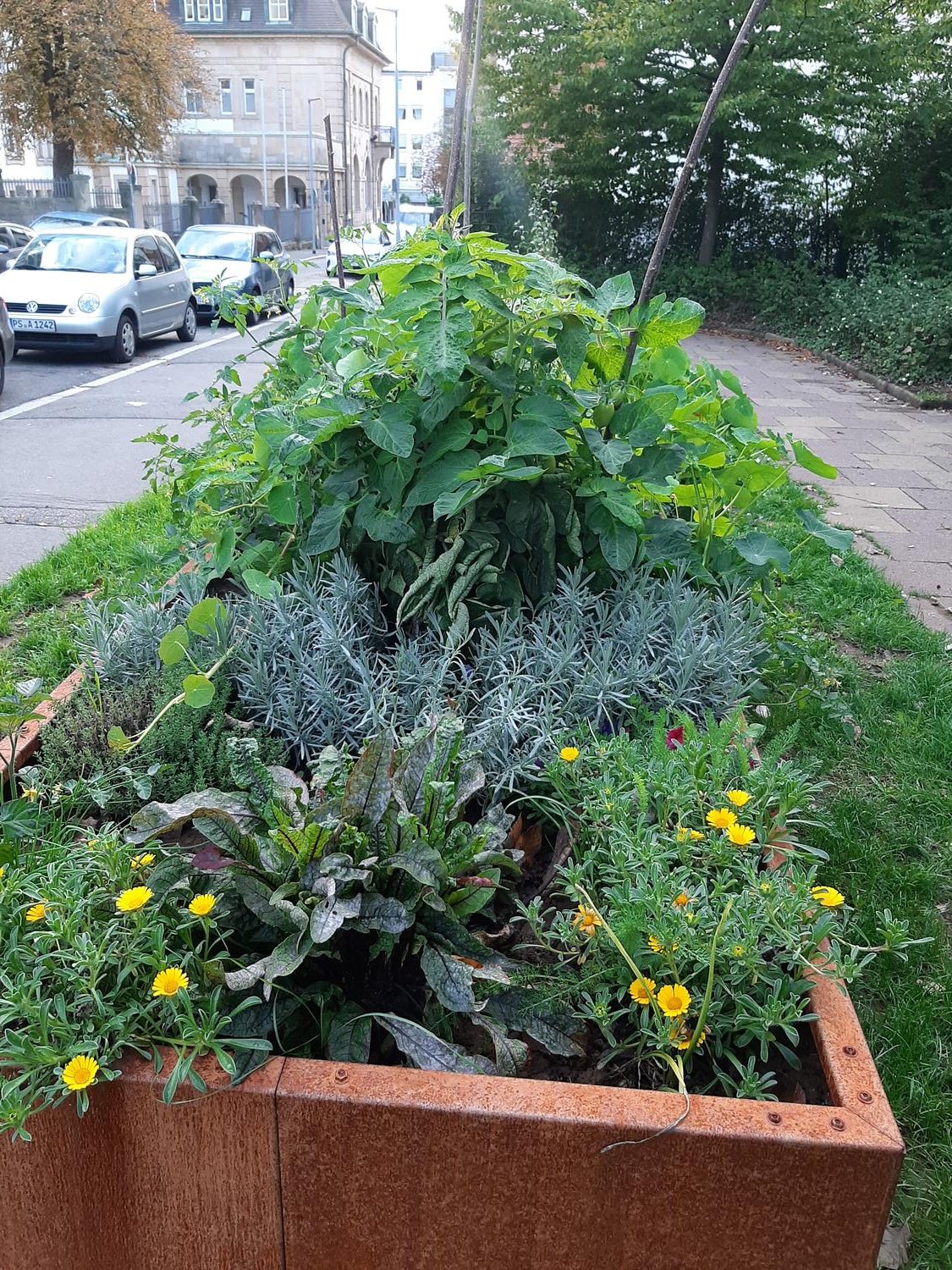 Das erste Gartenjahr der Garten AG neigt sich dem Ende entgegen. Viele Erfahrungen konnten wir sammeln -Kräuter und Sträucher bekamen „Beine", Blumen wurden „geköpft", viele Hunde „düngten" unseren Garten- das hat uns oft verärgert und enttäuscht. Trotzdem haben die positiven Aspekte allen Ärger überwogen. Viele Tomaten, Kartoffeln, Zucchini und Kräuter konnten wir ernten bzw. können noch immer geerntet werden. Die Bienen haben die bunten Blumen der Bienenwiesen gerne angenommen und die orangenen Blüten der Kapuzinerkresse sind nicht nur schmackhaft, sondern leuchten schön in der Herbstsonne. Viele Schüler*innen nutzen Freistunden oder die Mittagspause, um im Schulgarten zu sitzen, auch die Pirmasenser Bürger nehmen inzwischen gerne auf den Bänken Platz und schauen sich die Pflanzen und Bäume des Schulgartens an.