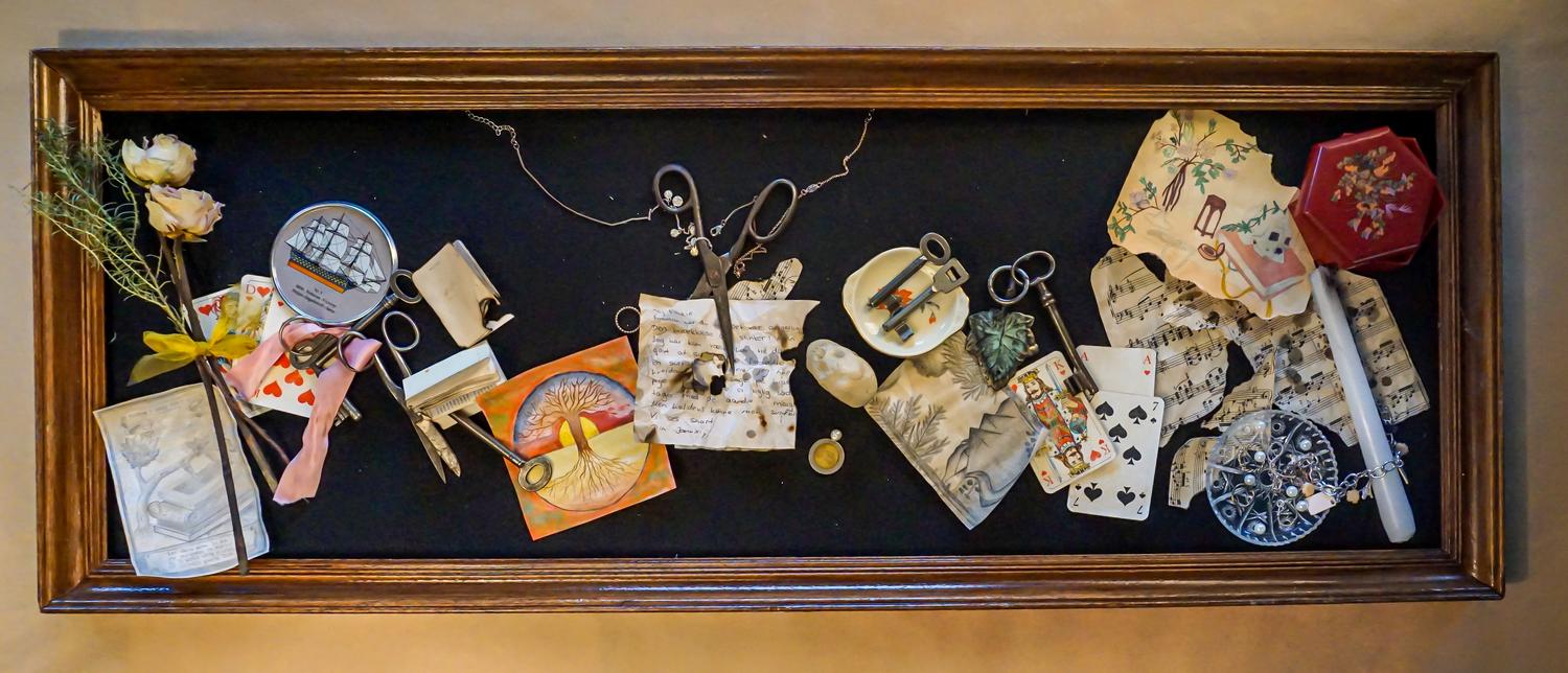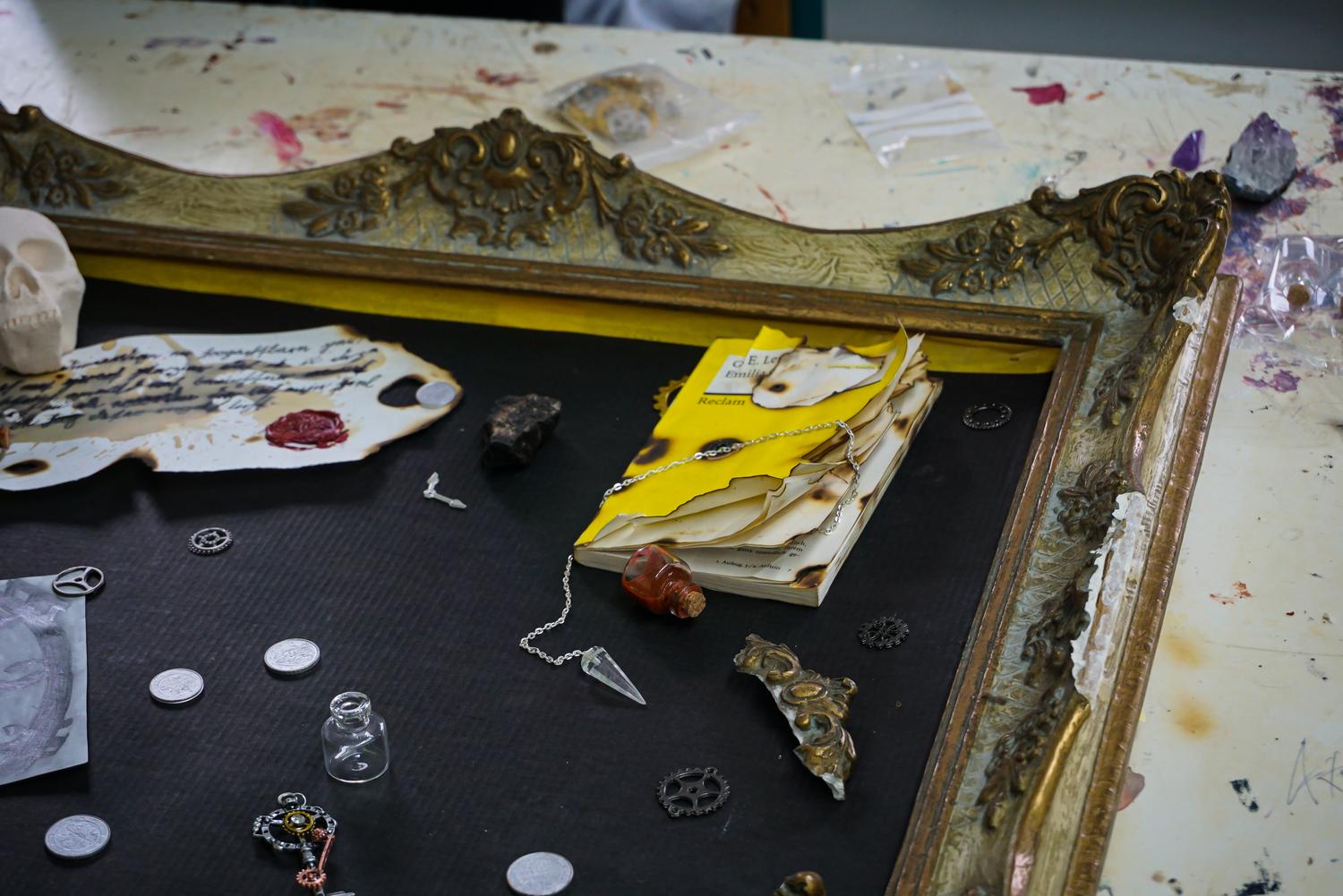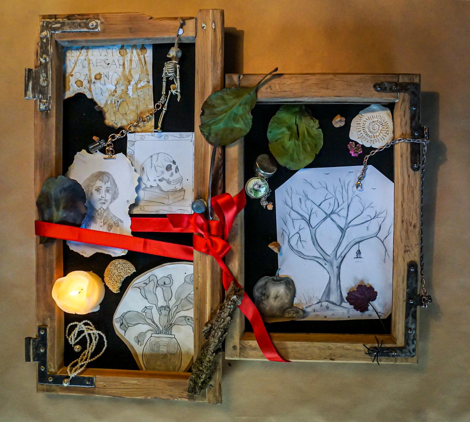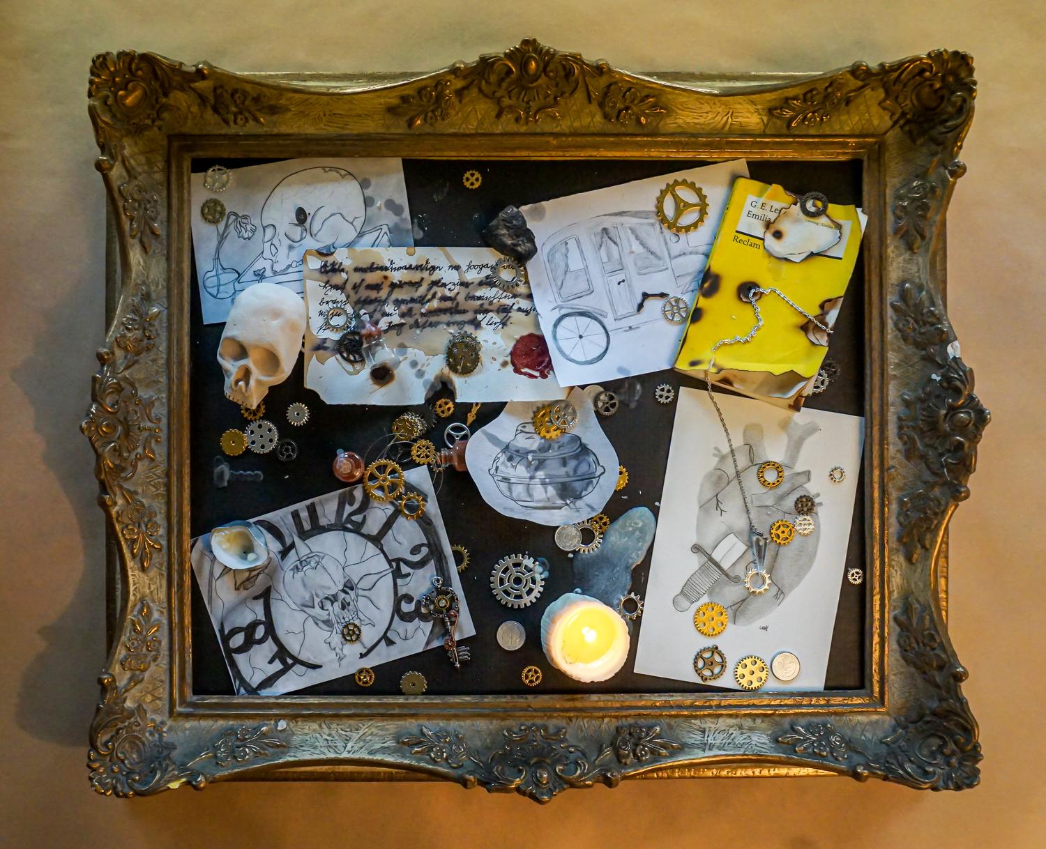 In Teams wurden im Grundkurs 12 eigene barocke Steckbretter erarbeitet. In alten Bilder- und Fensterrahmen arrangierten die Schüler und Schülerinnen Gegenstände und Zeichnungen, die sowohl zeitlich, als auch thematisch in das „Goldene Zeitalter des Stilllebens", in den niederländischen Barock passen könnten.
