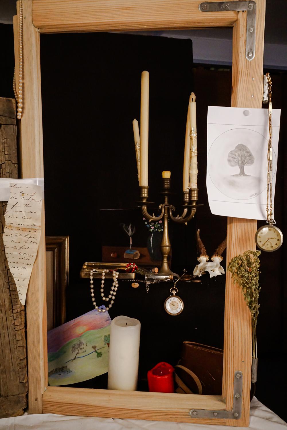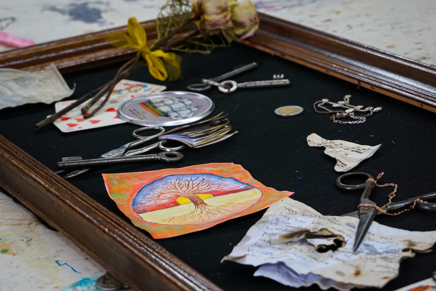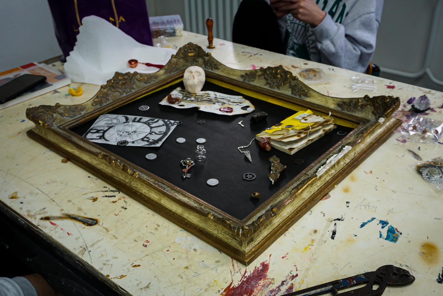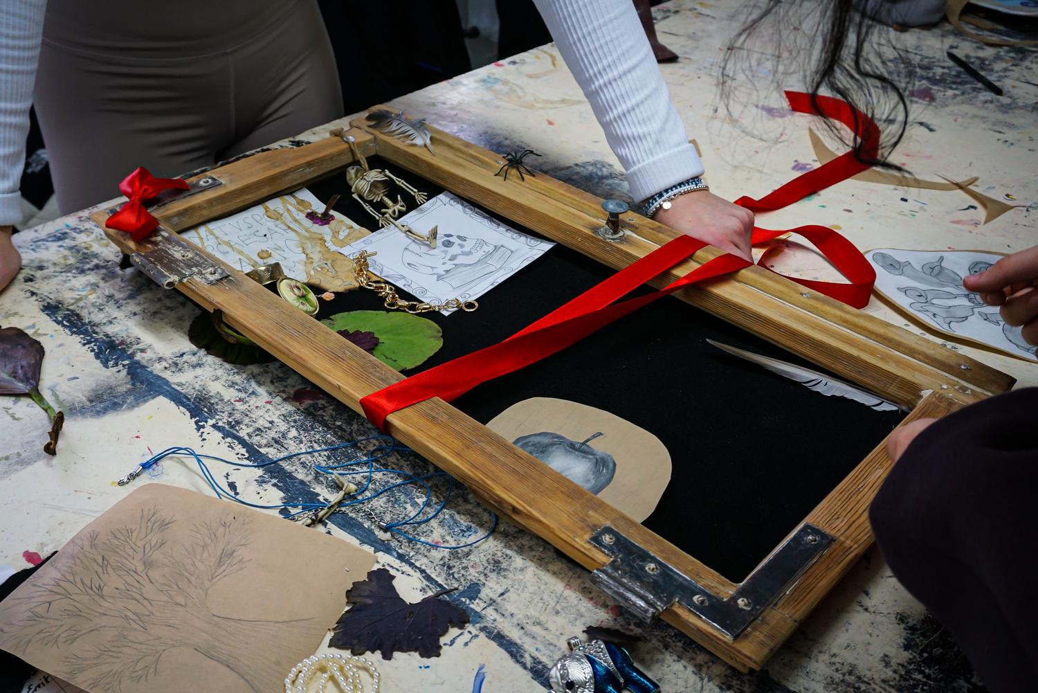 In Teams wurden im Grundkurs 12 eigene barocke Steckbretter erarbeitet. In alten Bilder- und Fensterrahmen arrangierten die Schüler und Schülerinnen Gegenstände und Zeichnungen, die sowohl zeitlich, als auch thematisch in das „Goldene Zeitalter des Stilllebens", in den niederländischen Barock passen könnten.