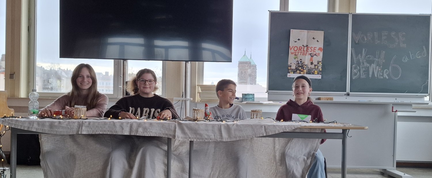 Am 02. Dezember 2025 war es soweit. Die vier Klassensieger*innen der sechsten Klassen kamen im Beisein all ihrer Mitschüler*innen und unseres Schulleiters Herr Mohr im großen Musiksaal zusammen. Dort präsentierten sie ihr Lese-Können, um den Schulsieger/ die Schulsiegerin zu ermitteln.